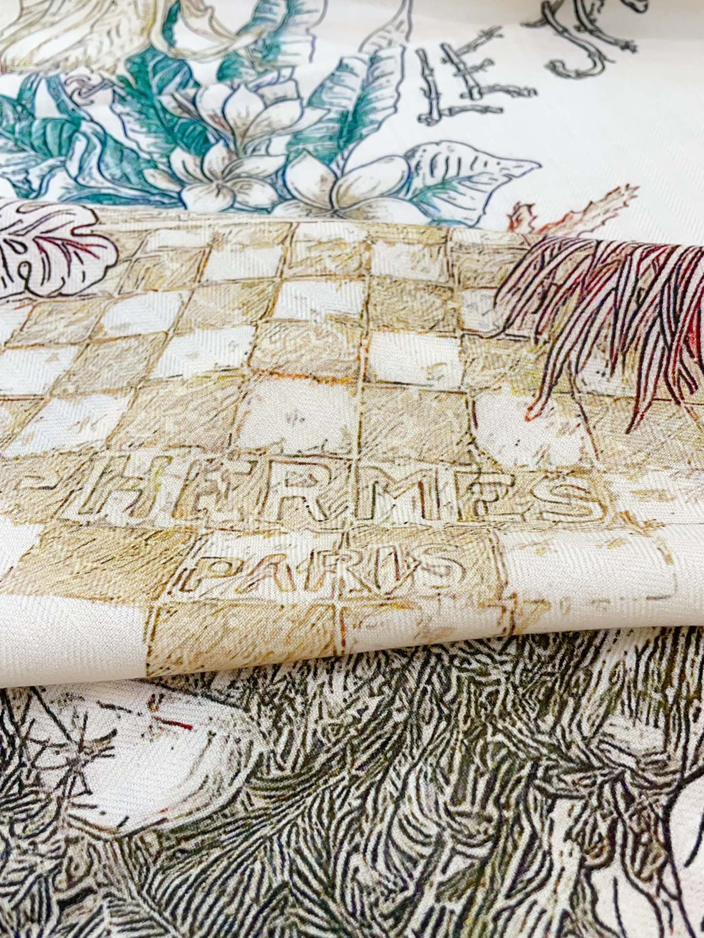 Guepards Bandana Double Face Scarf 140 CM In White Mix Beige Colorful Cashmere And Silk 334192