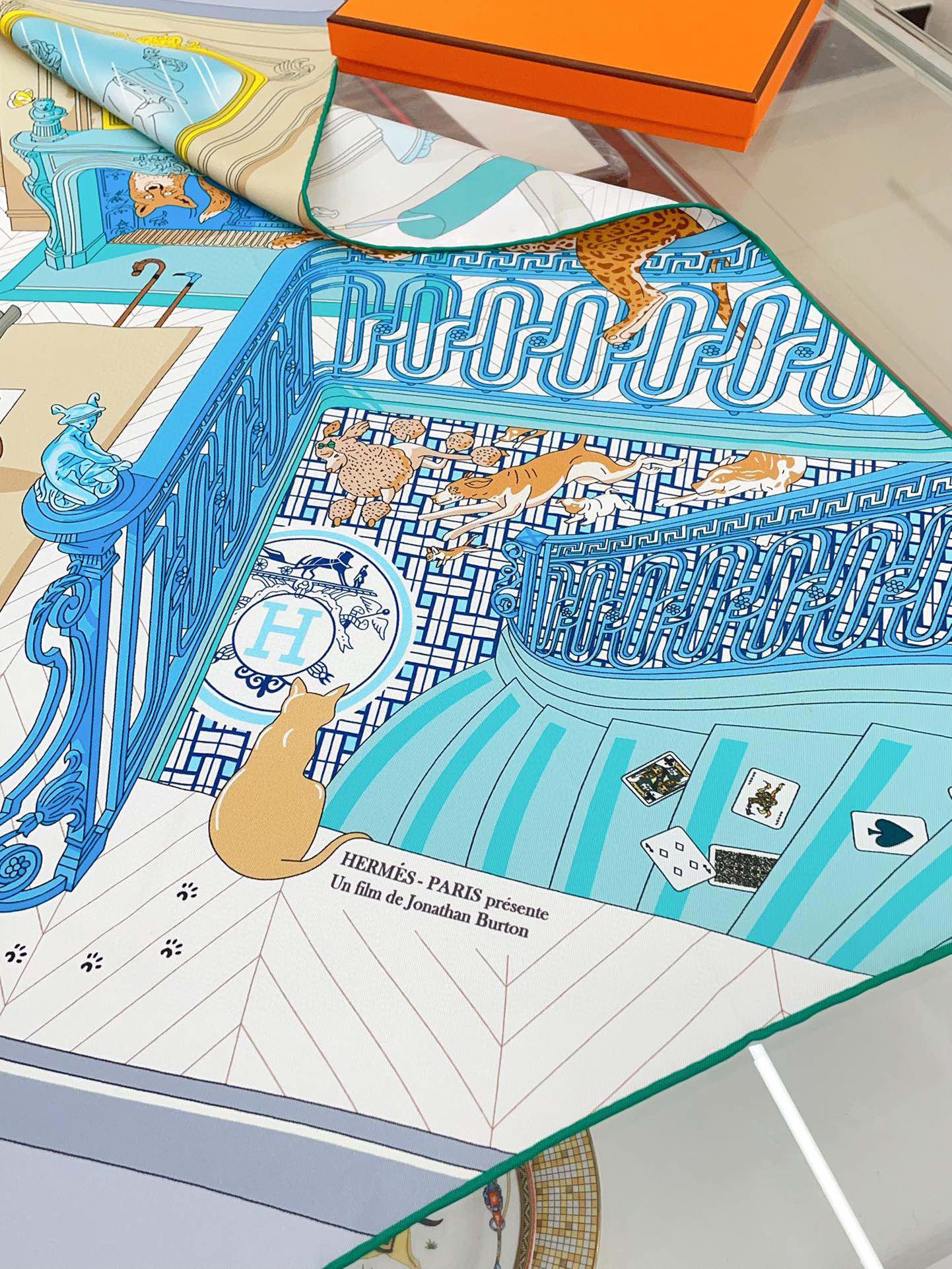 Guepards Bandana Double Face Scarf 140 CM In Light Turquoise Colorful Cashmere And Silk 334191