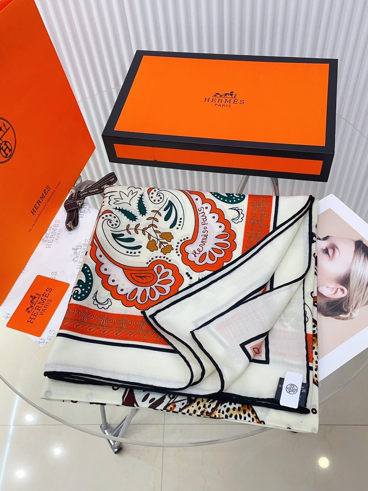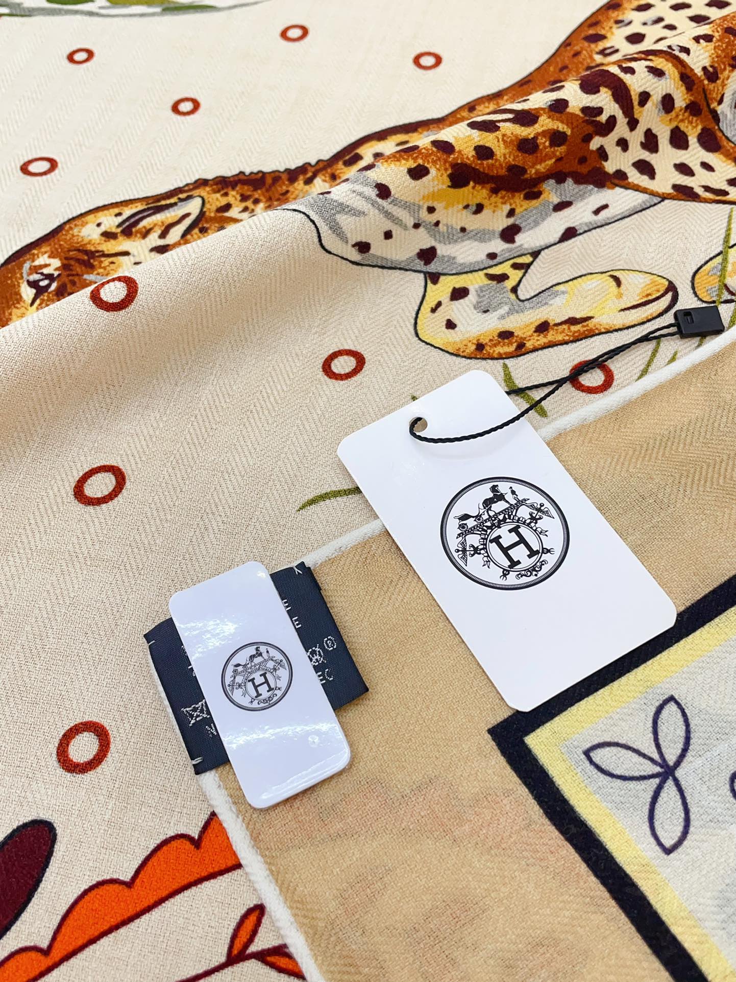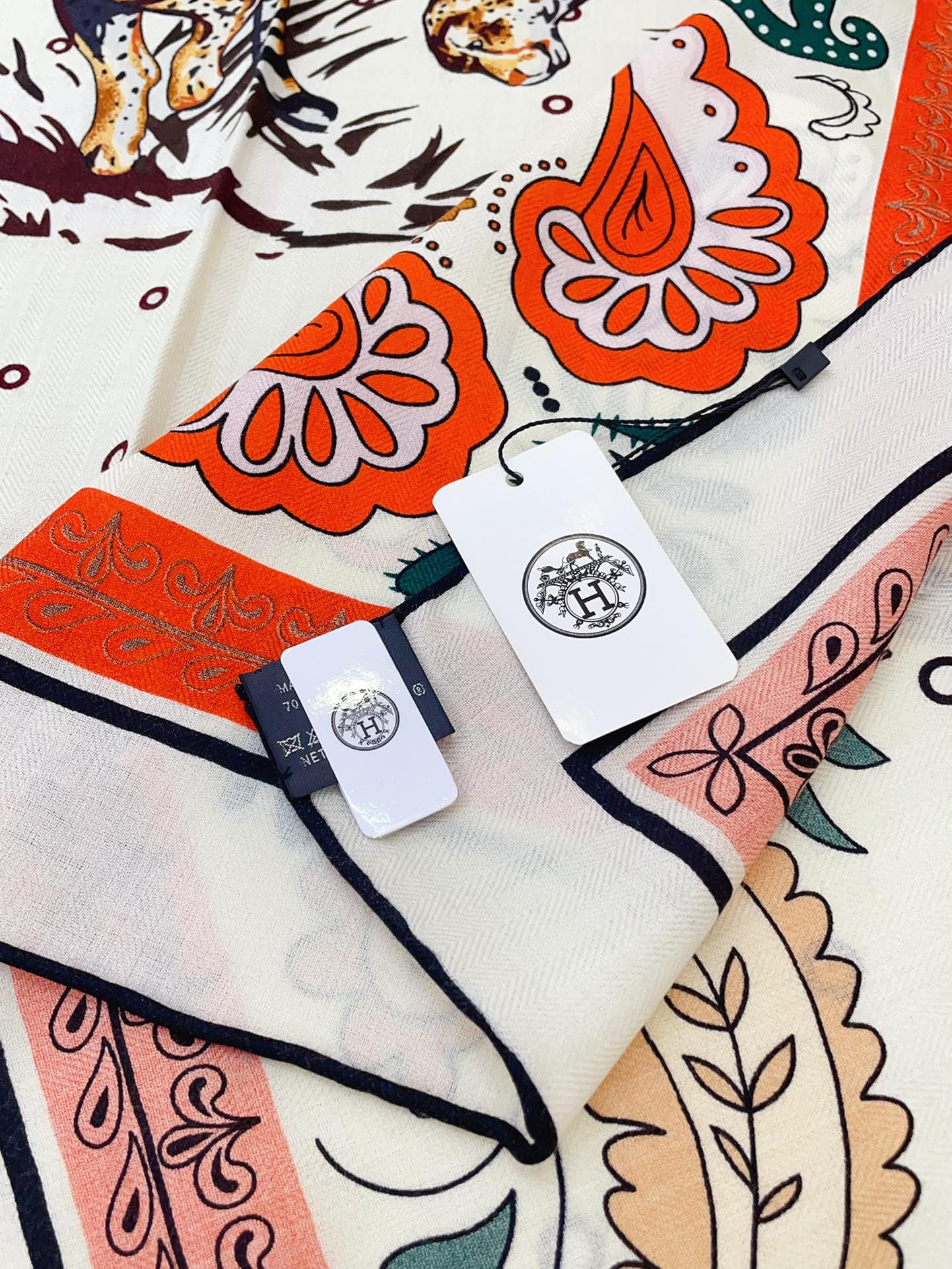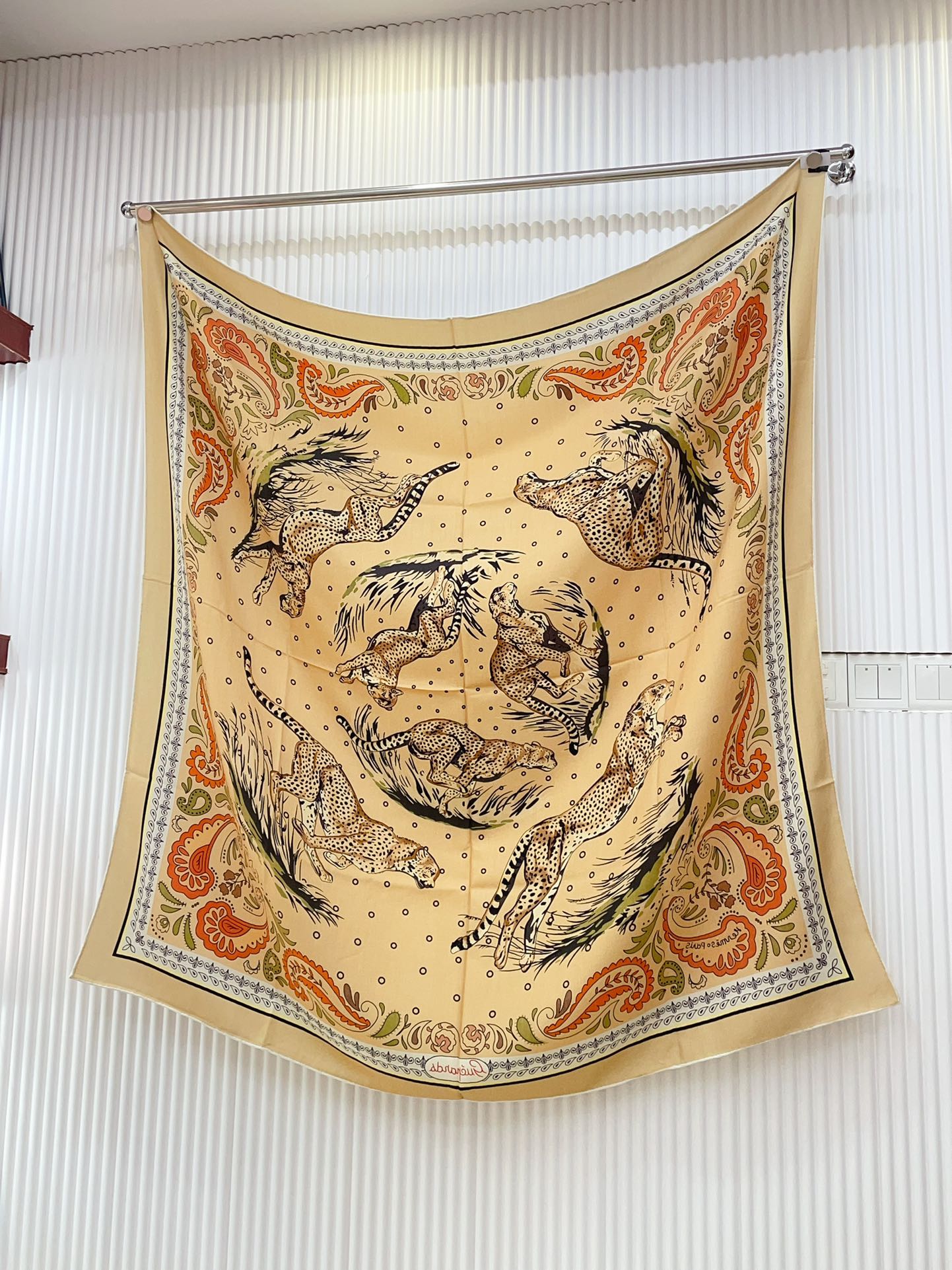Guepards Bandana Double Face Scarf 140 CM In Beige Mix Orange Colorful Cashmere And Silk 334189