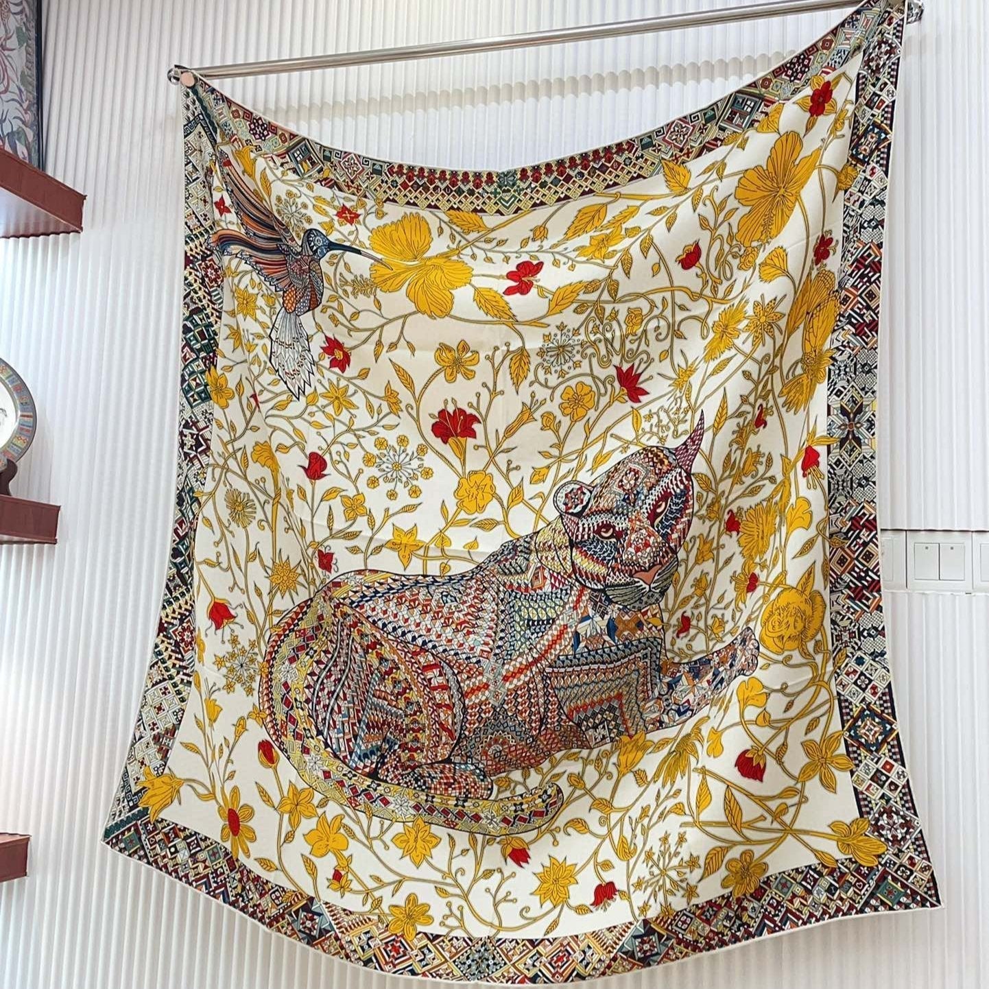 Le Jaguar Et Le Colibri Shawl 135 CM Yellow Colorful Cashmere And Silk 357903