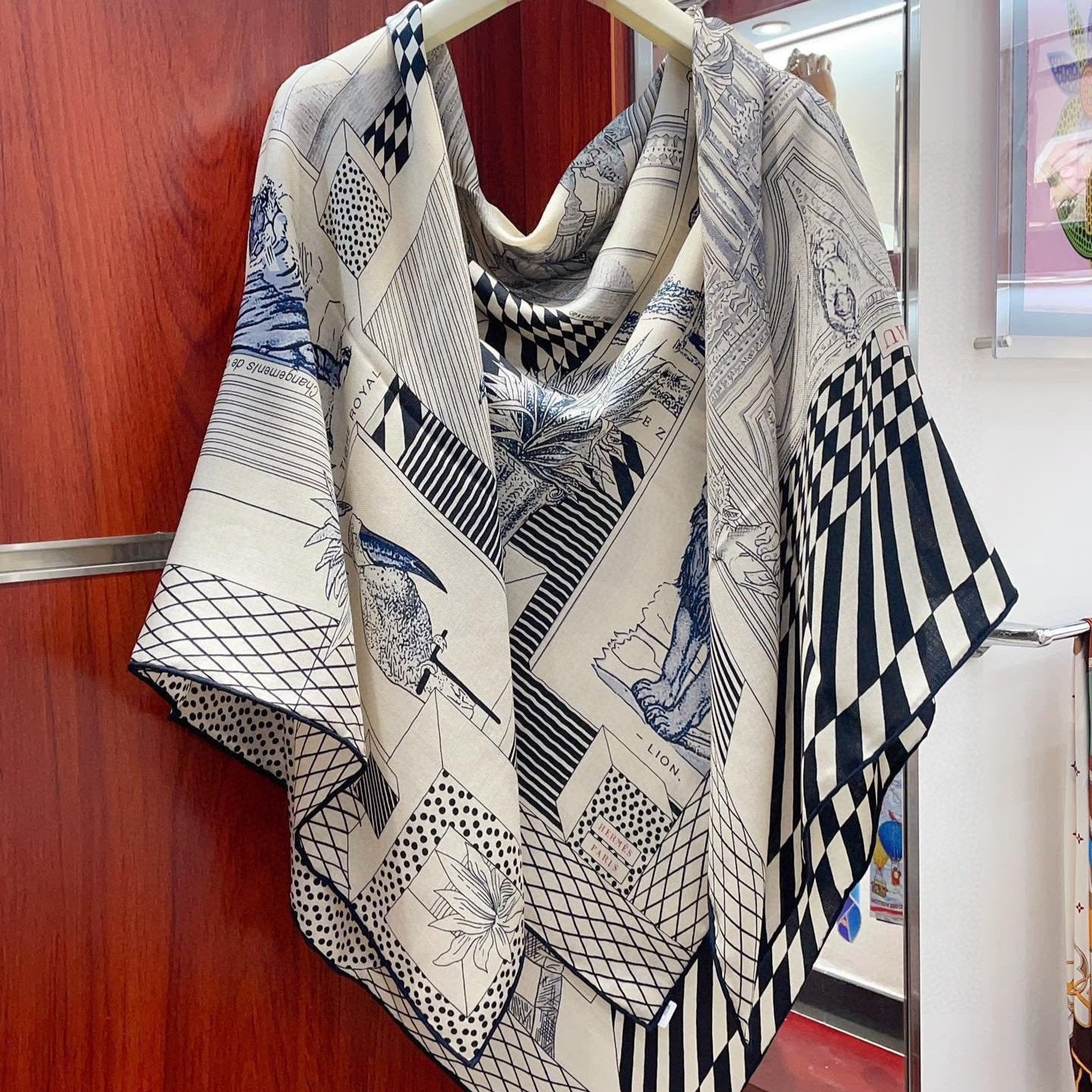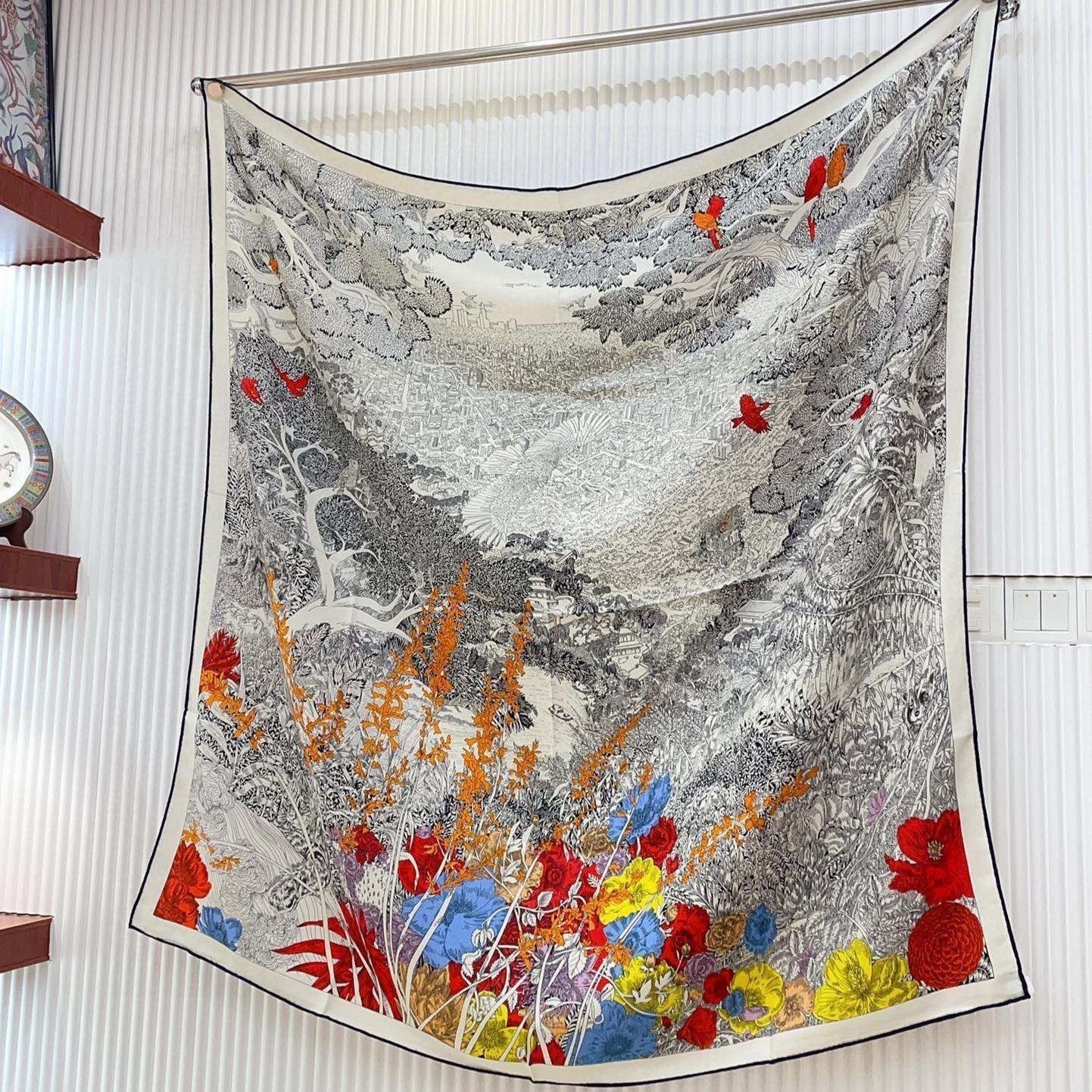 Retour A La Nature Shawl 140 CM White Black Colorful Silk
