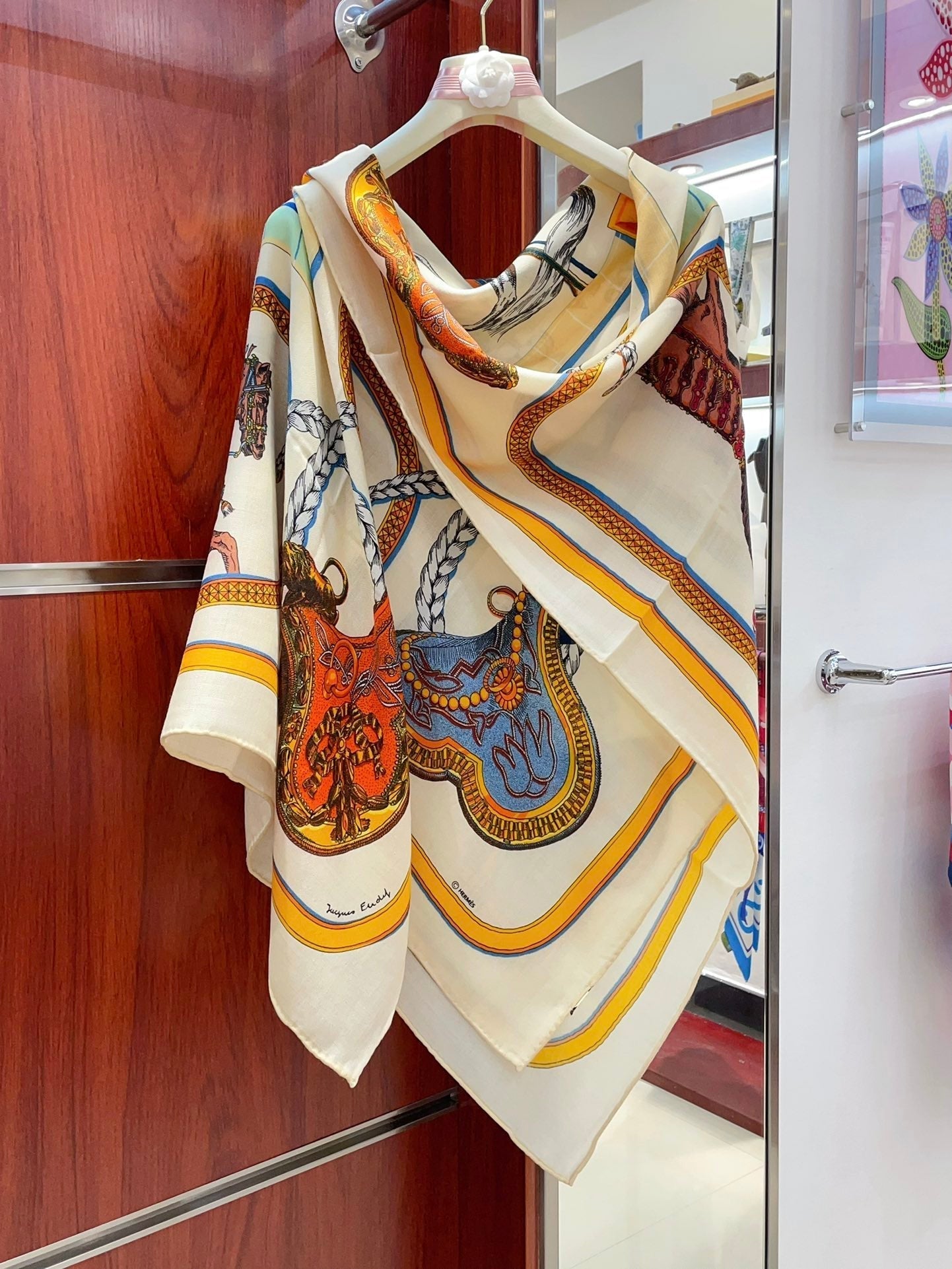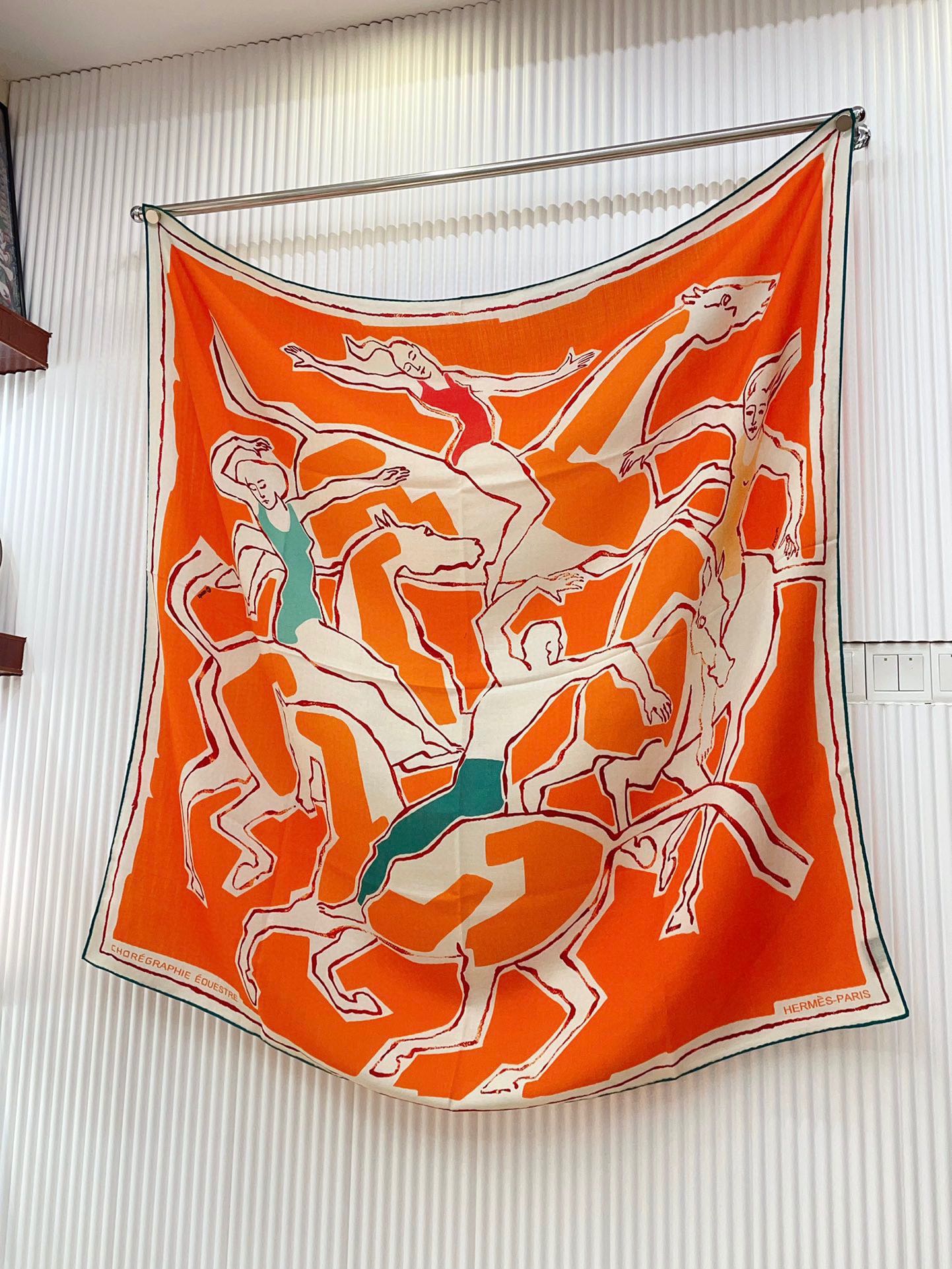 Chevaux Dechaines Shawl 135 CM IN Orange Colorful Cashmere Silk 373685
