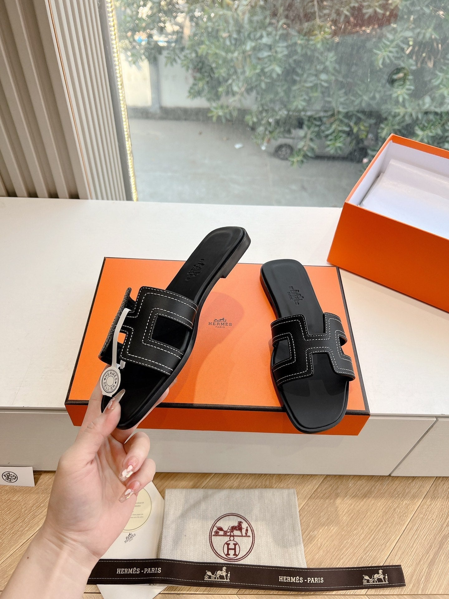 HM 25 Oran Sandal Black Calfskin White Thread Embroidery