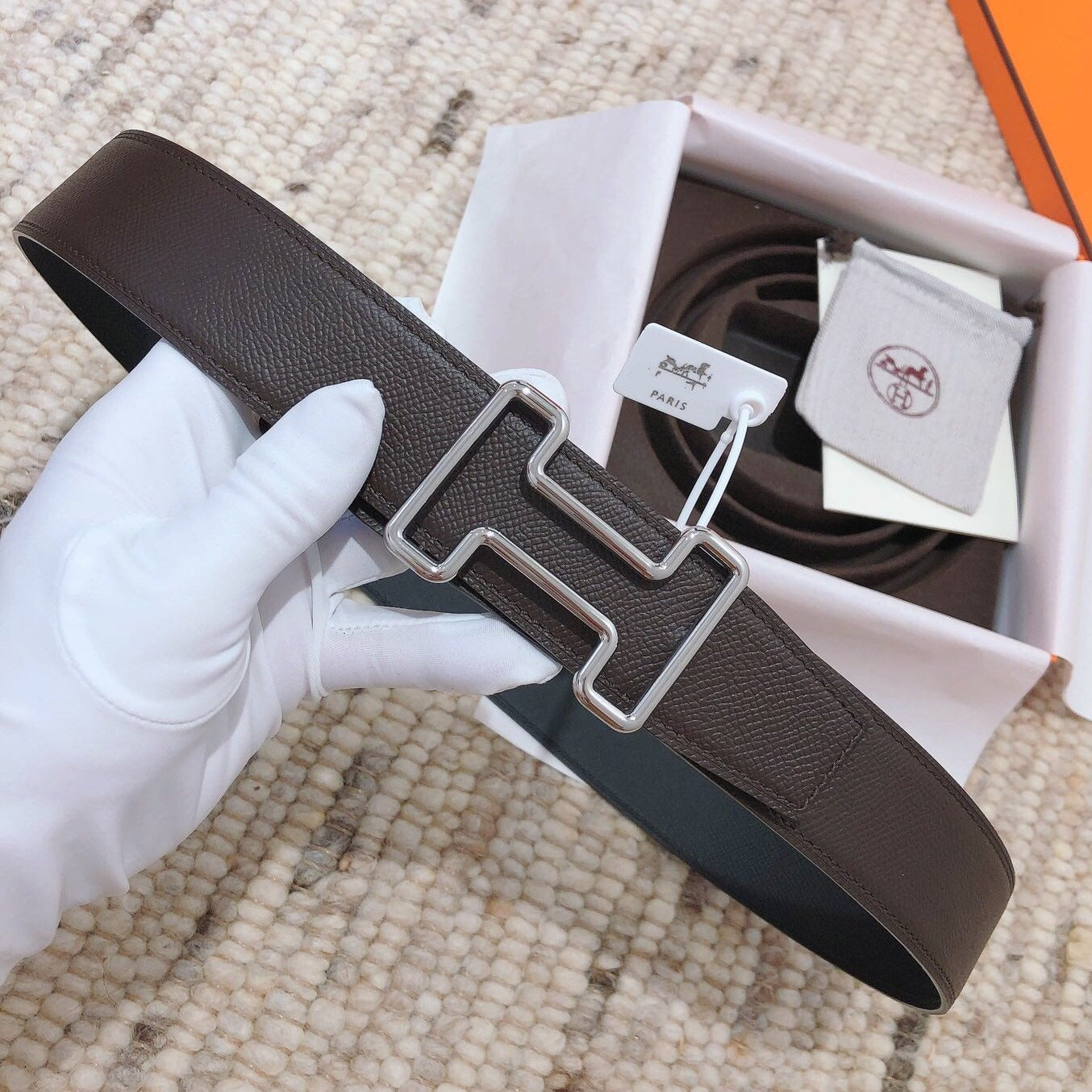 H BELT SILVER BUCKLE DARK BROWN BLACK LEATHER RIVERSIBLE 3.8CM