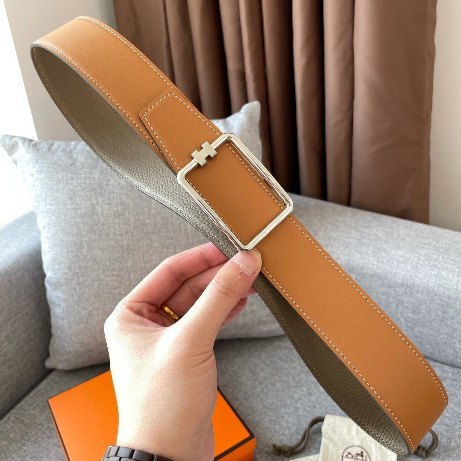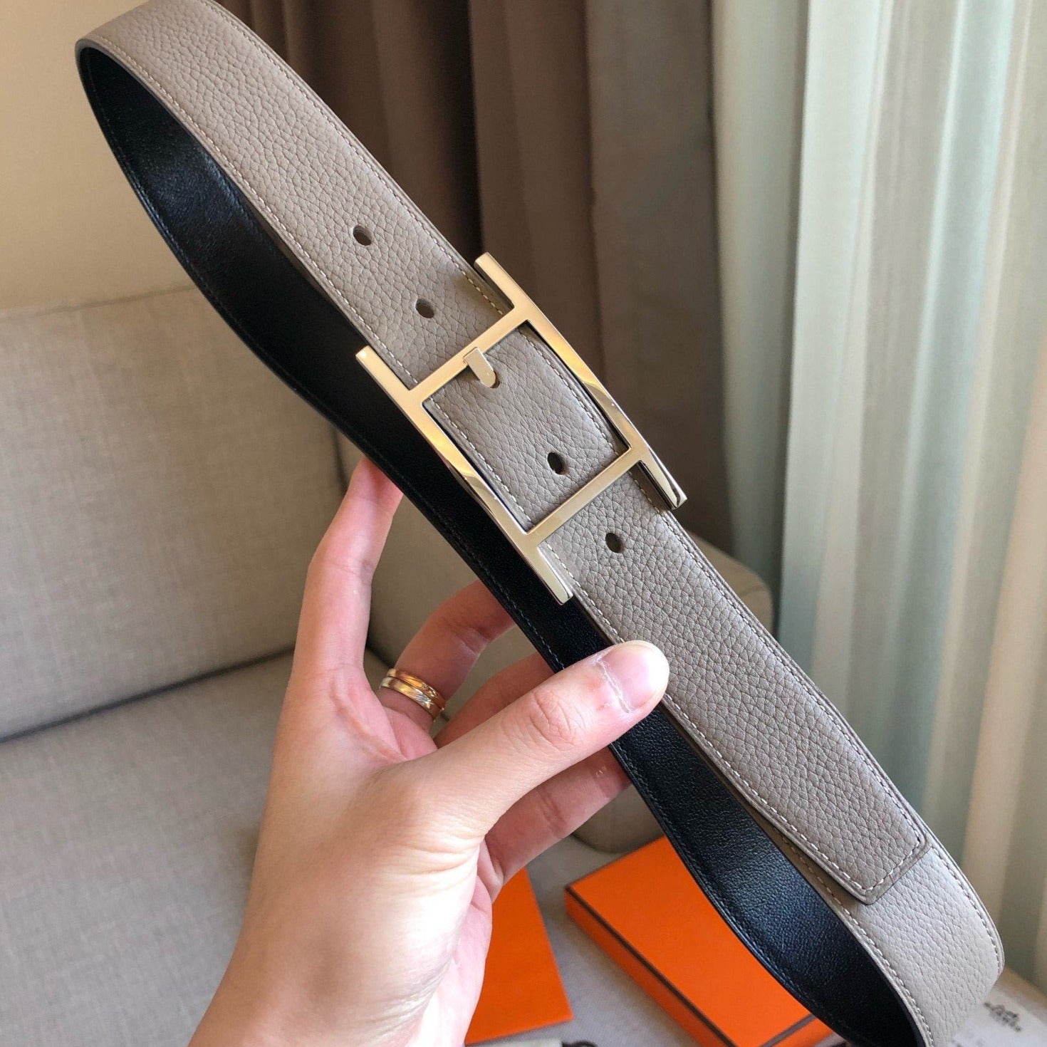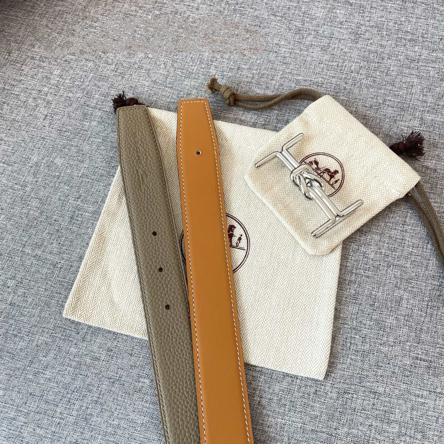 H MARIN REVERSIBLE BELT 32MM SILVER BUCKLE GOLD TIN GREY LEATHER