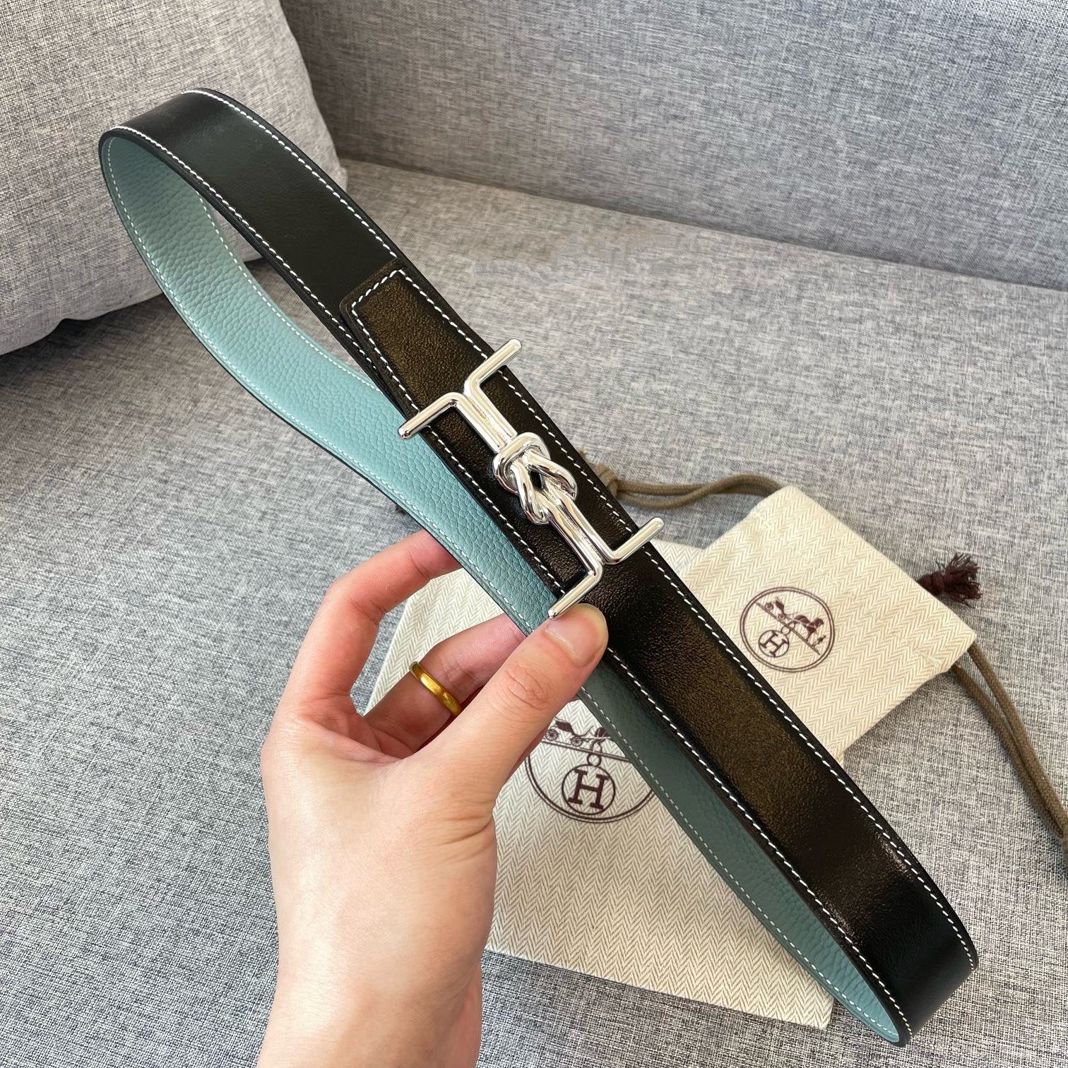 H TWIN REVERSIBLE BELT 32MM SILVER BUCKLE CHOCOLATE DARK BLUE LEATHER