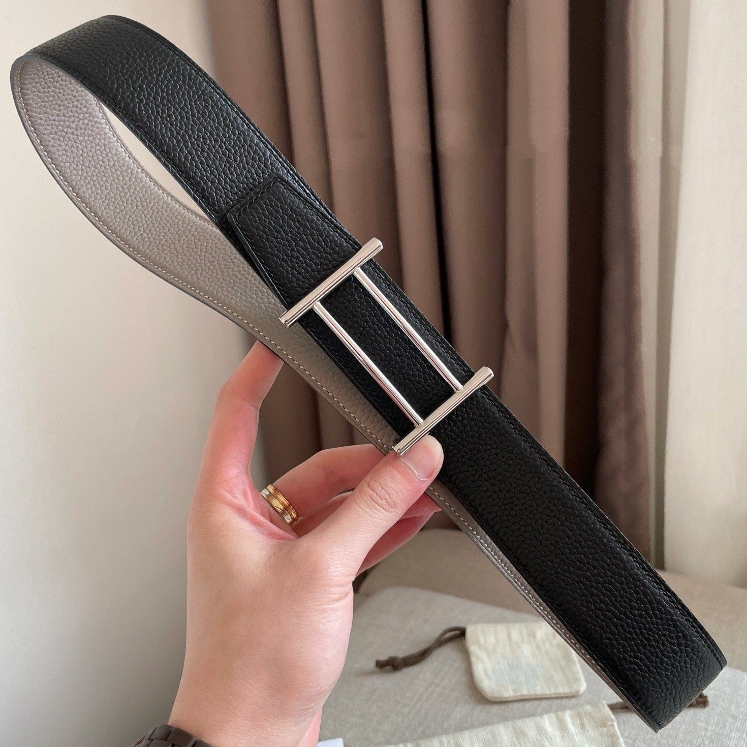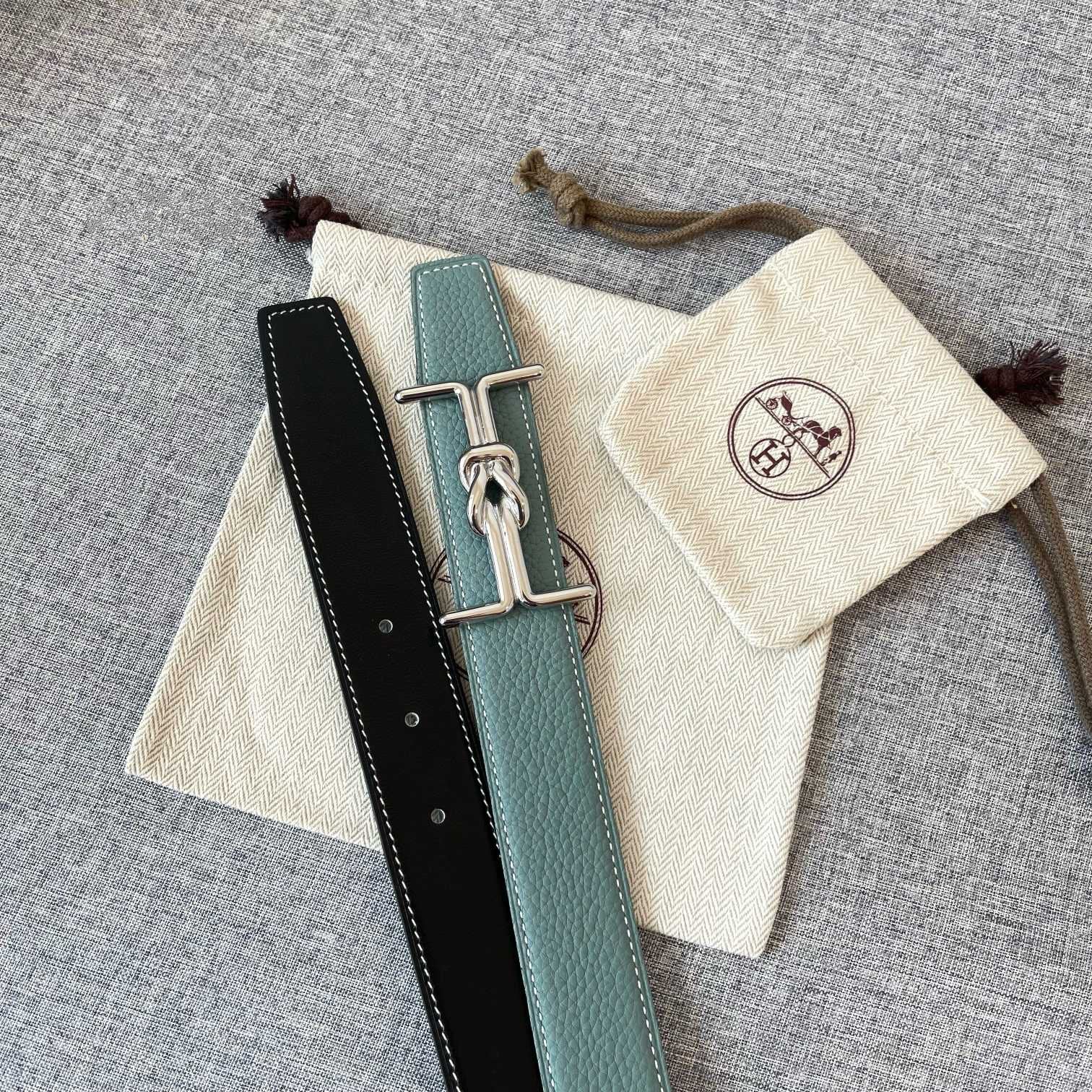 H BELT SILVER BUCKLE GREY BLACK LEATHER REVERSIBLE 3.2CM