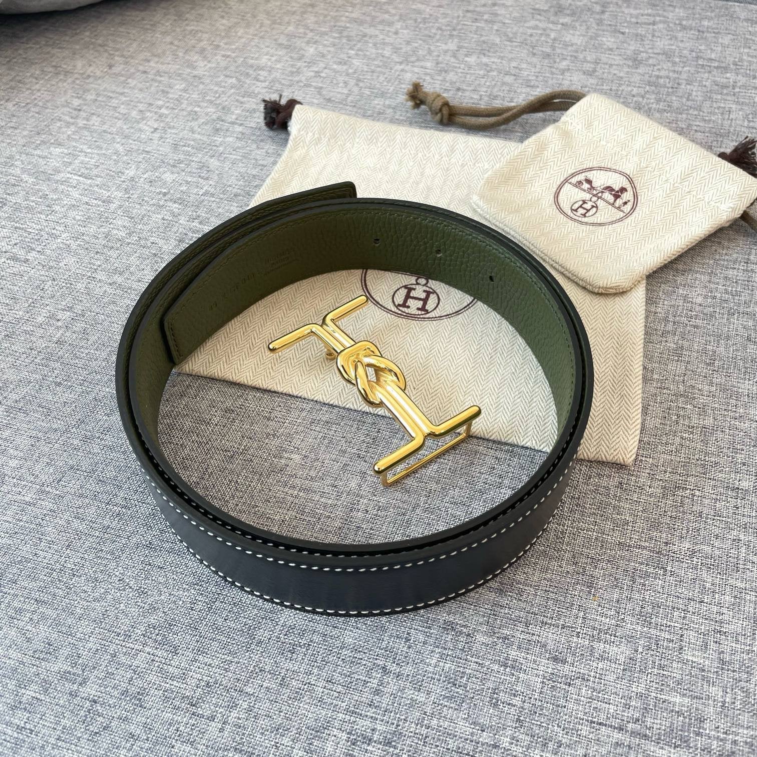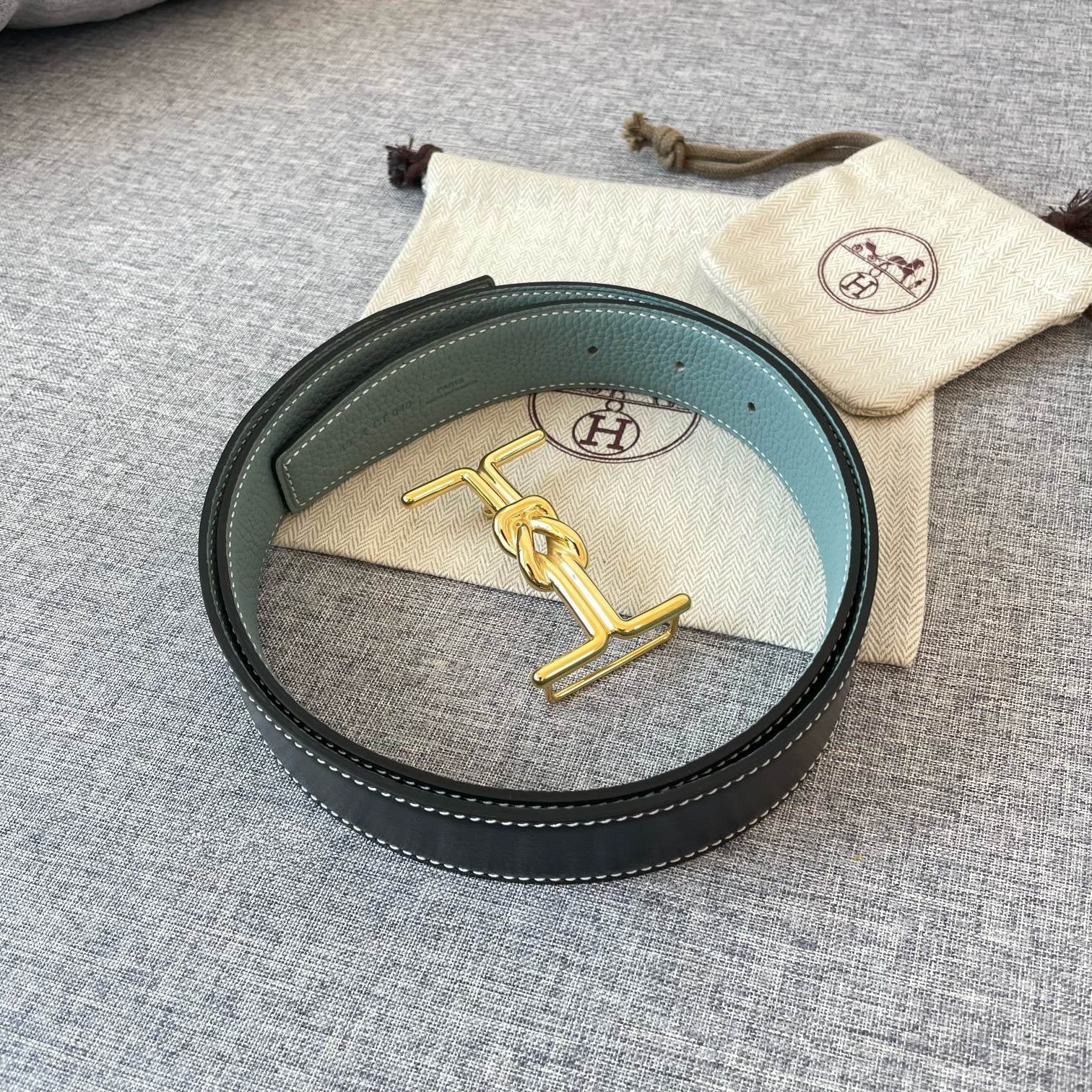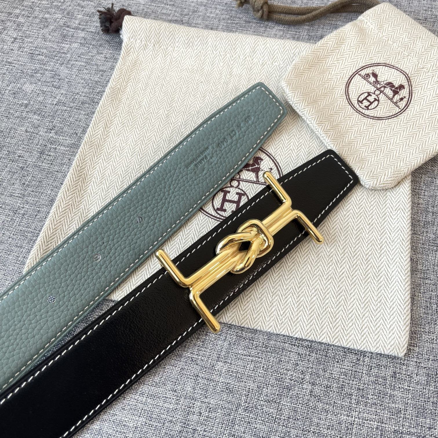 H TWIN REVERSIBLE BELT 32MM GOLD BUCKLE GREEN GREY GOLD LEATHER