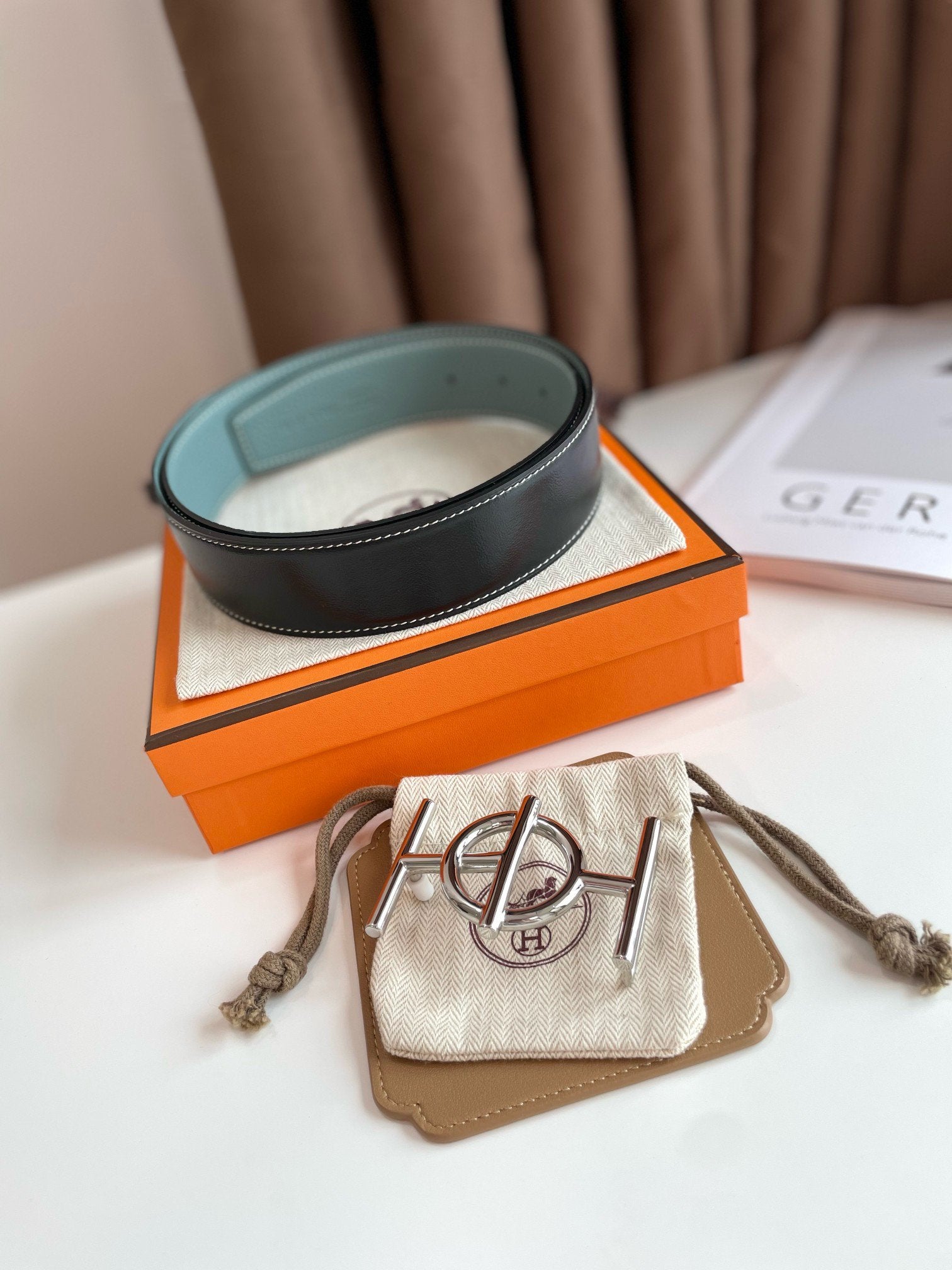 H CONTANCE BELT 38MM SILVER BUCKLE BLACK BLUE LEATHER