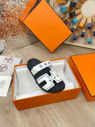 chypre sandal white black calfskin black thread embroidered