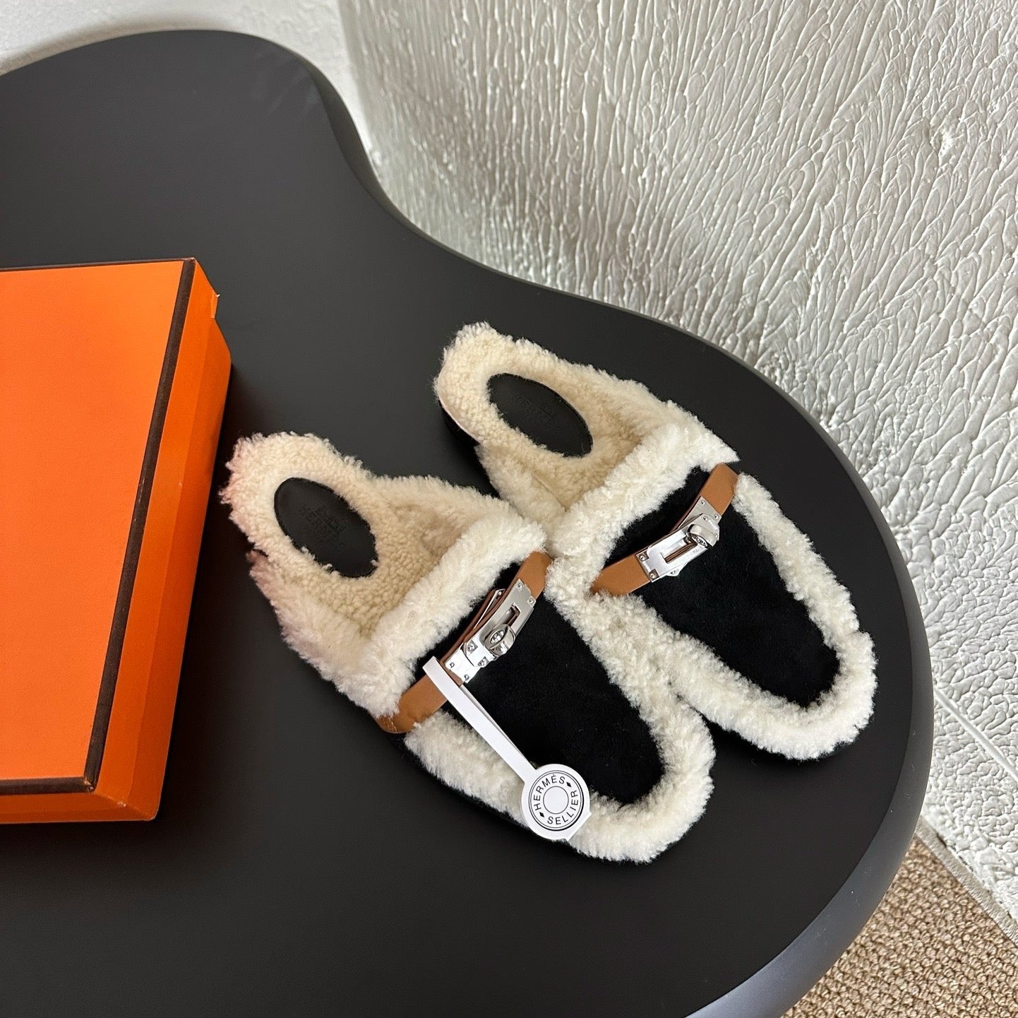 HM Chypre Sandal In Black White Lambskin And Fleece Lining 961138