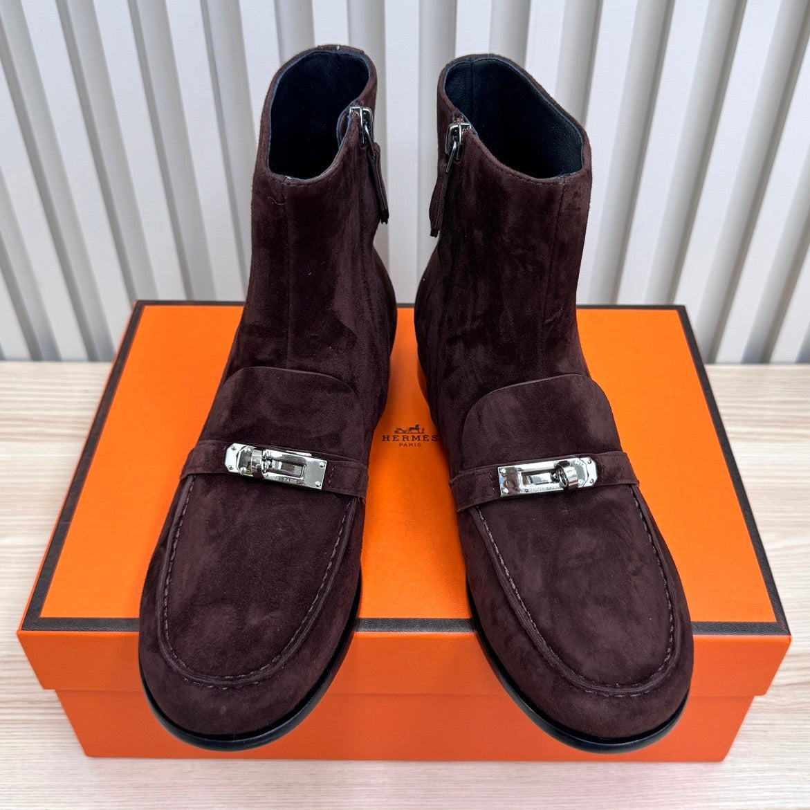 HM 25 Kelly Buckle Ankle Boots Rich Brown Silver Suede 513082