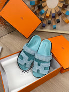chypre sandal turquoise blue suede calfskin white thread embroidered
