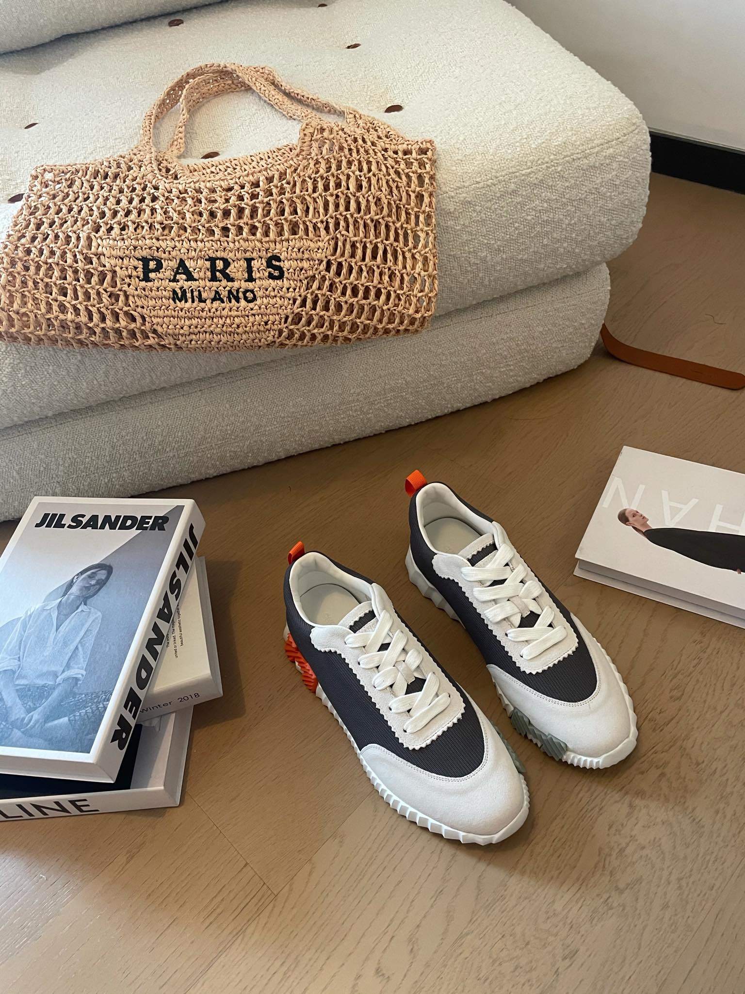 HM Bouncing 35 Sneakers White Canvas Blue Suede Goatskin Orange H Seafoam