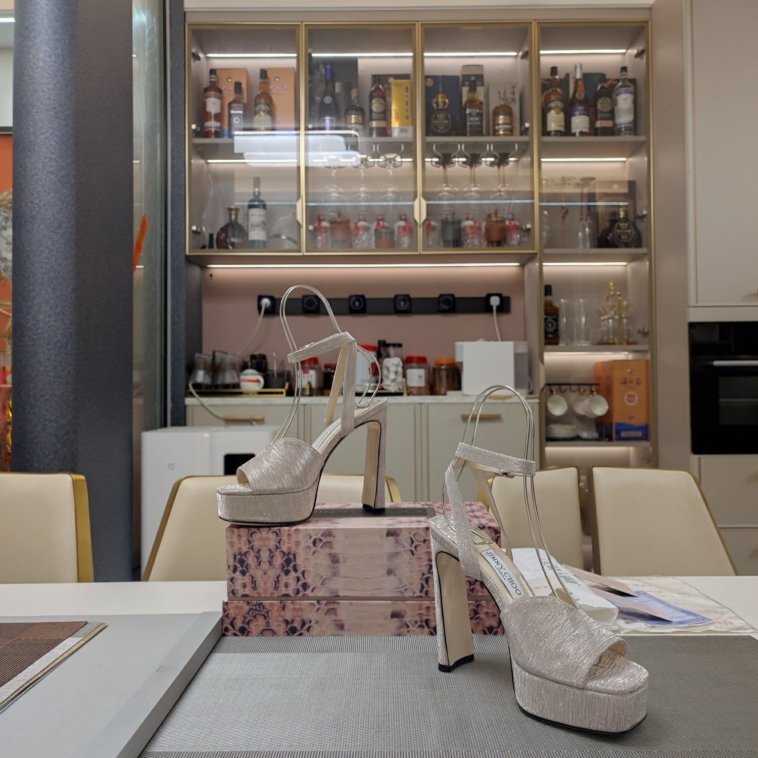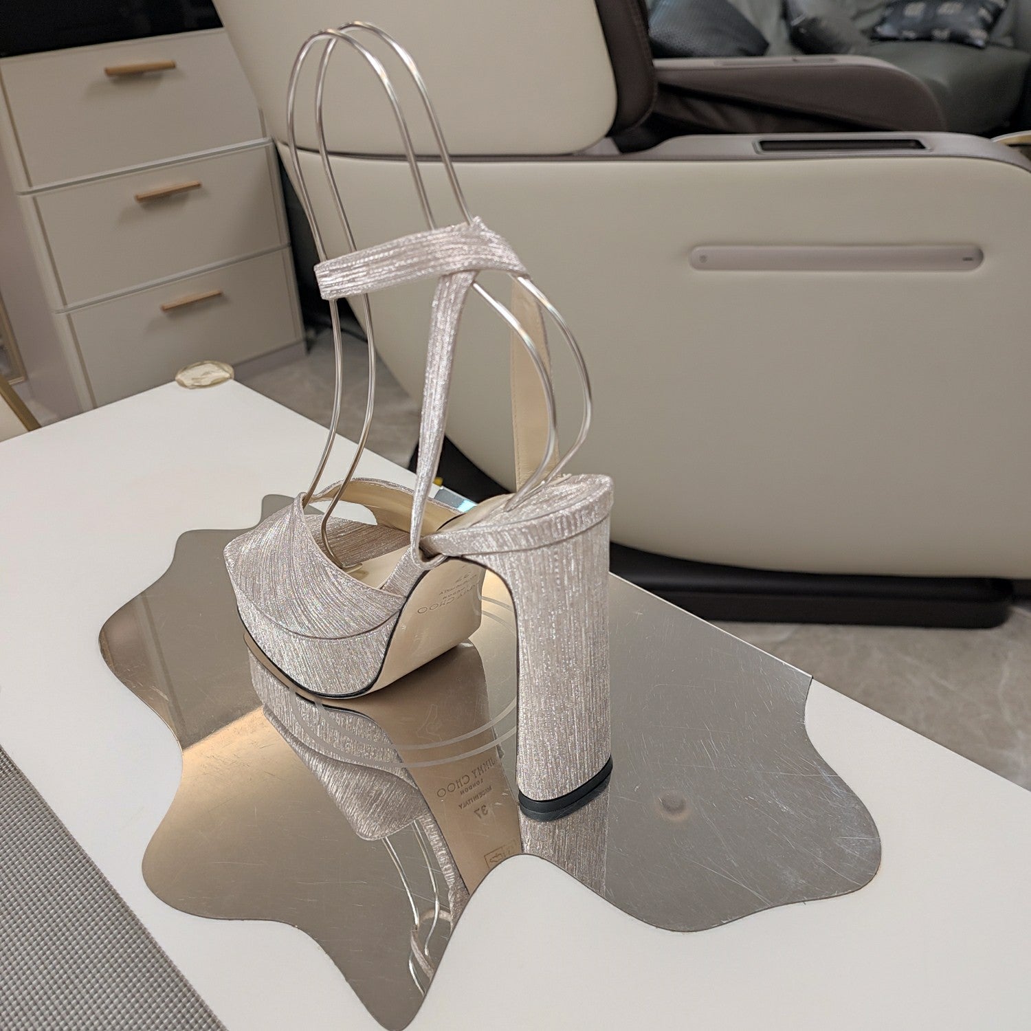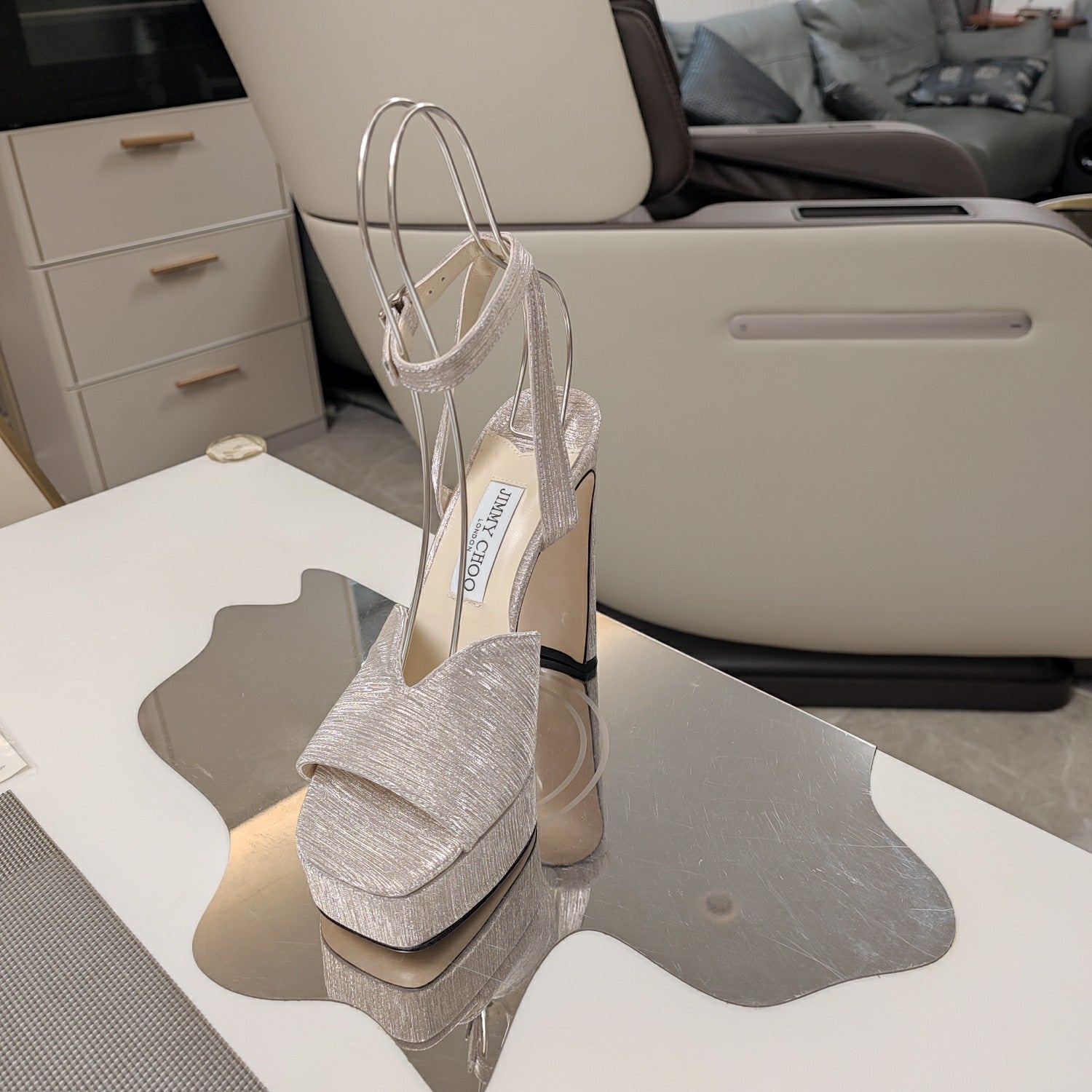 Jimmy 25 Platform Sandal Heels Silver Satin Fabric 240016