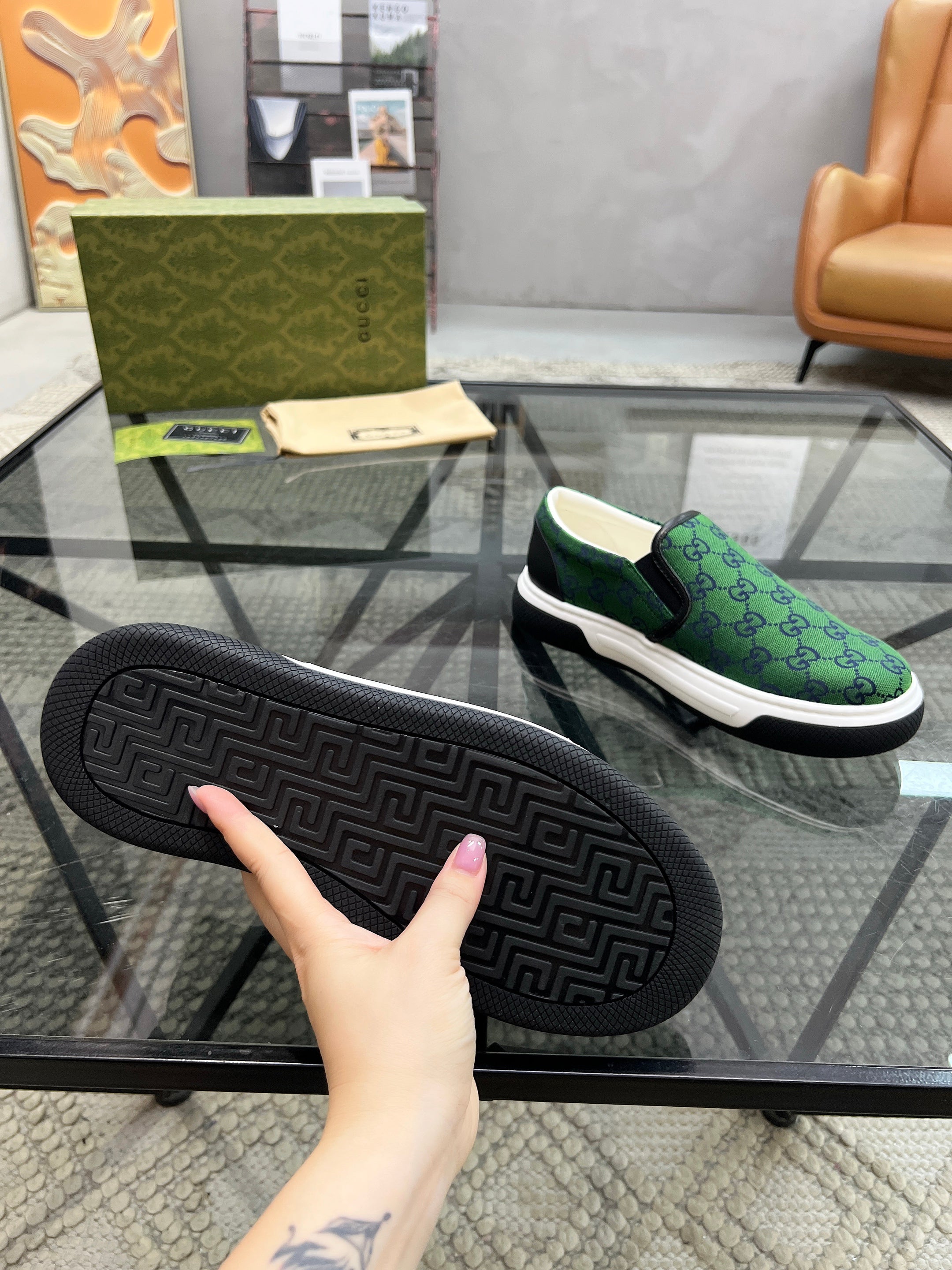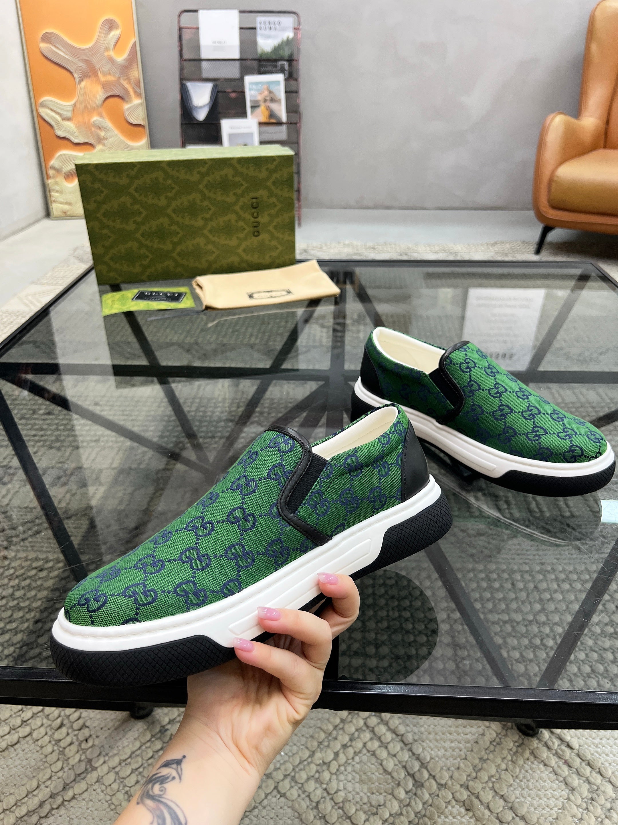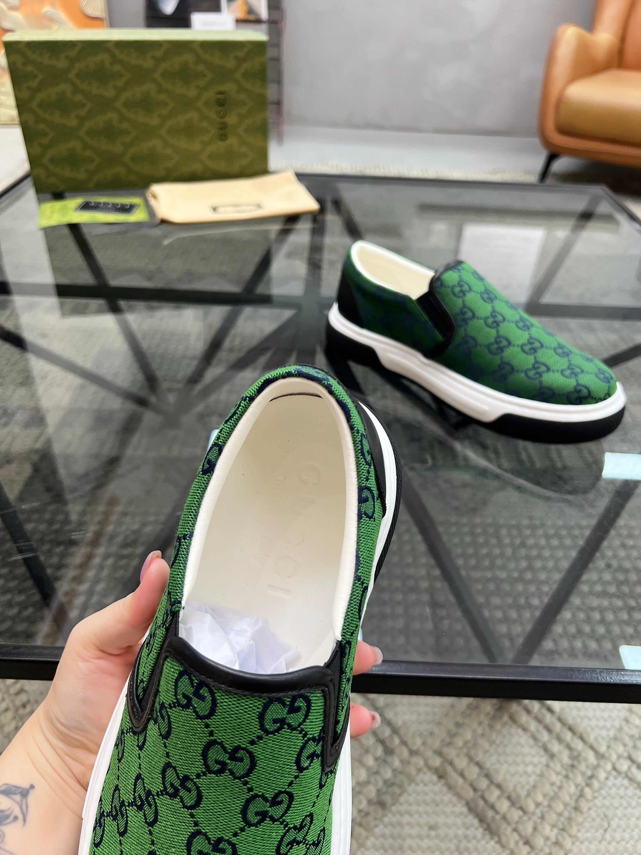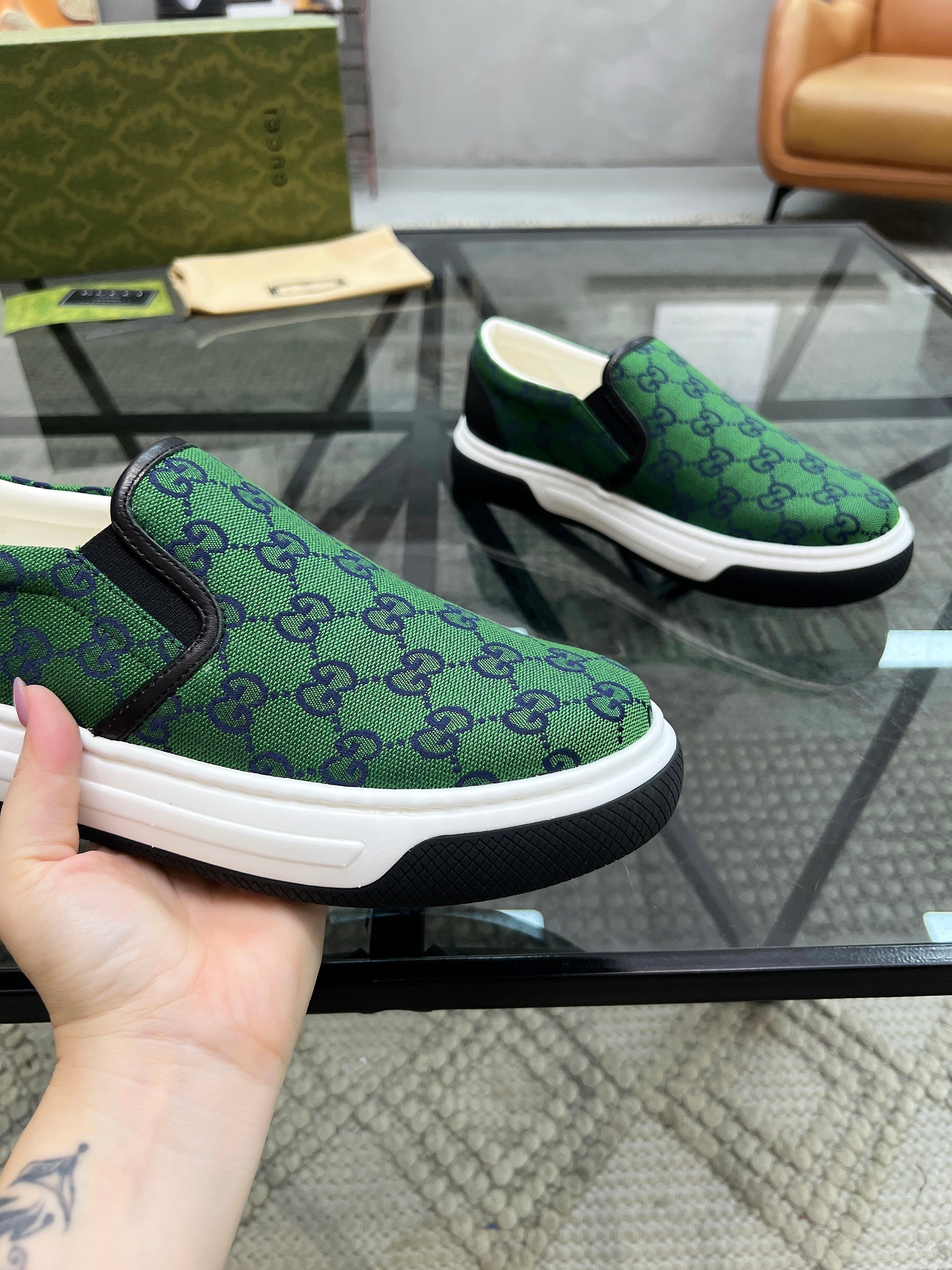 GG Men's Slip on Loafer Green Printed Fabric 721522