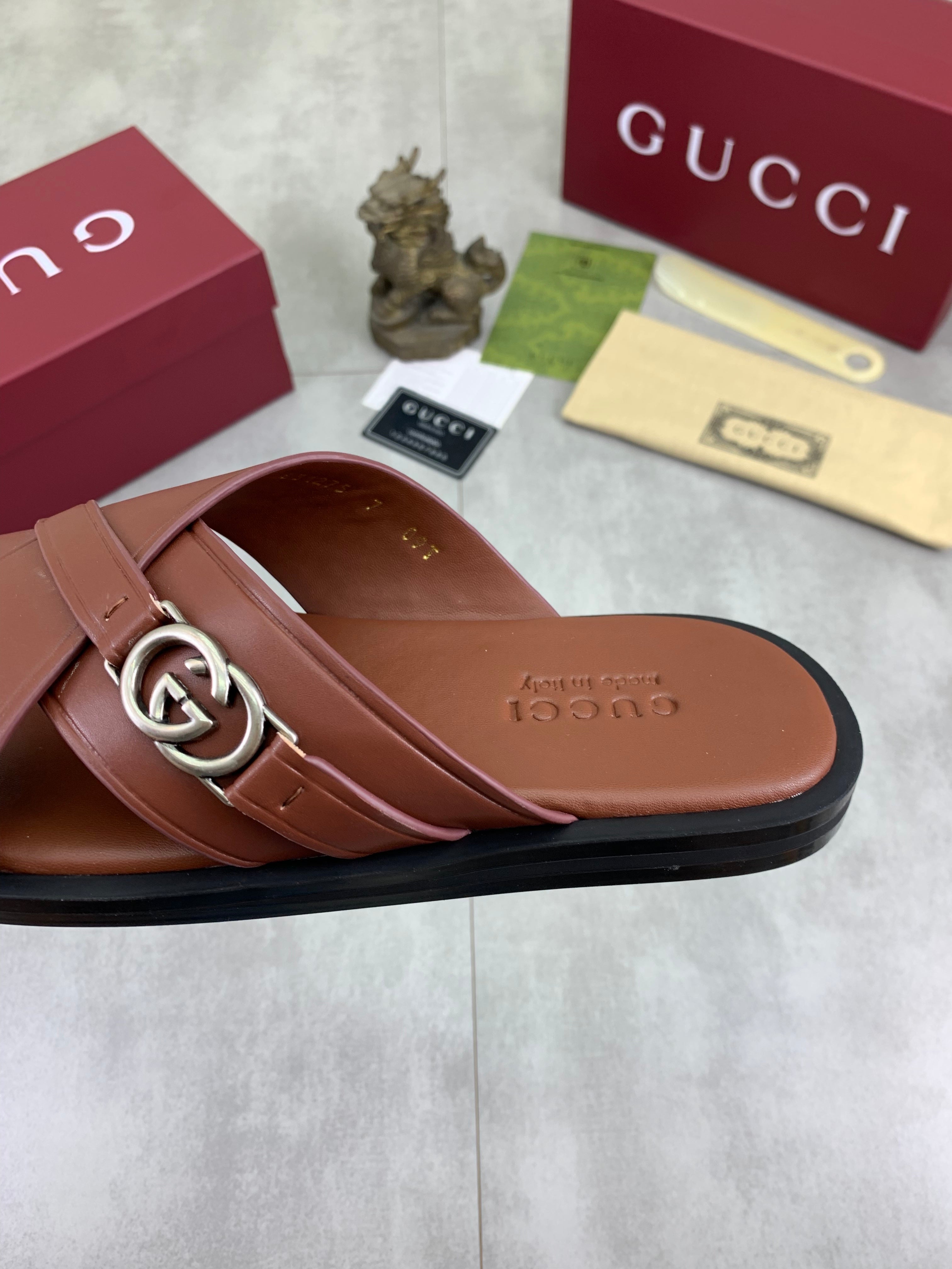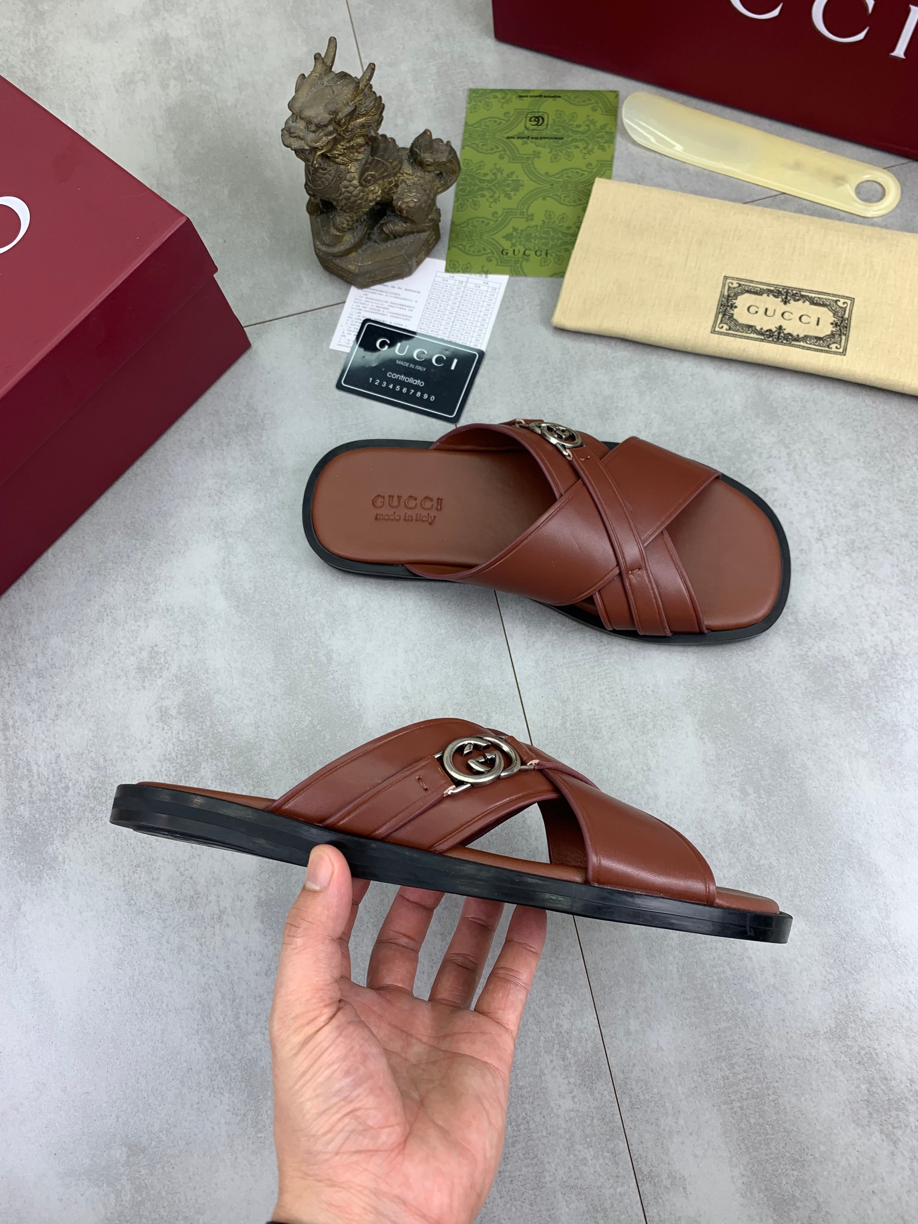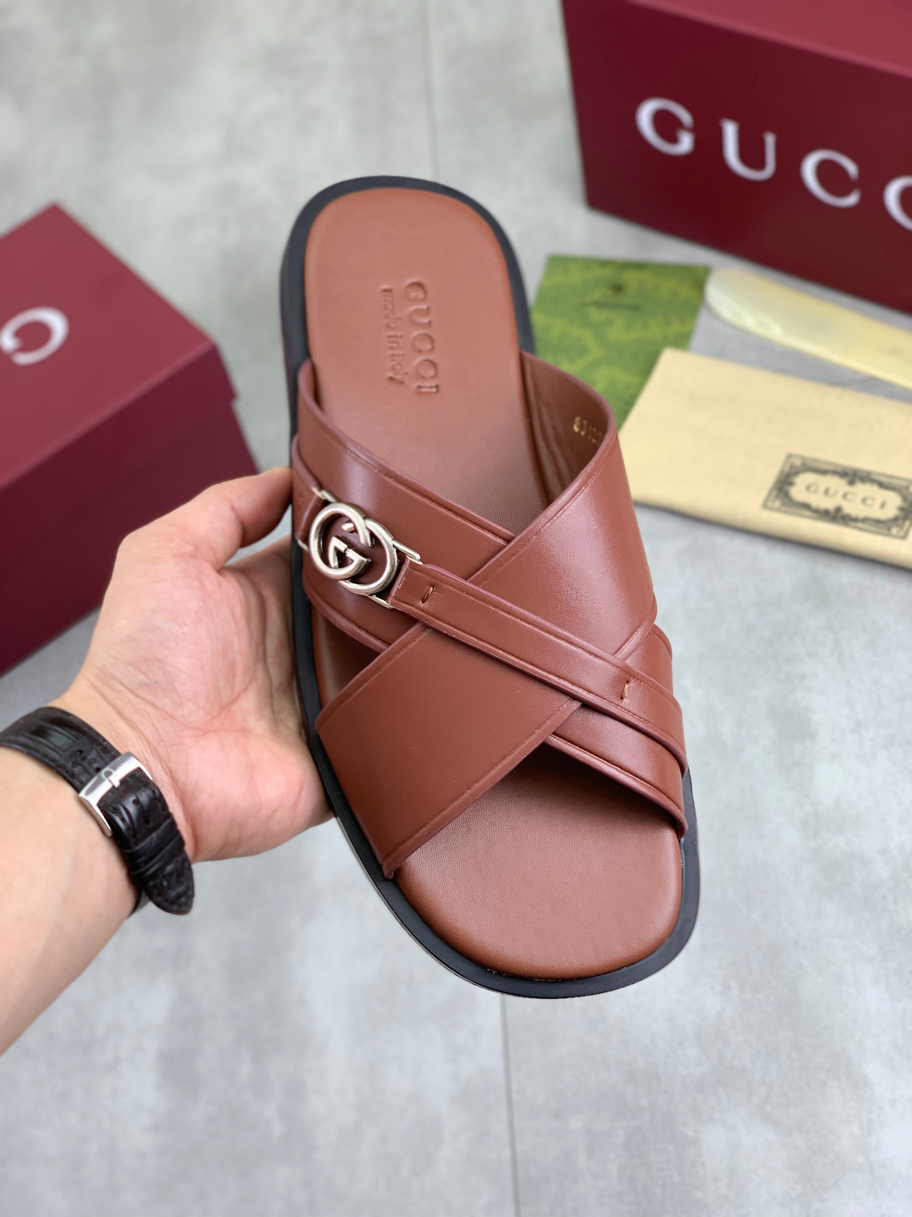 GG Men's 25 Sandals Slide Brown Cowhide 738473