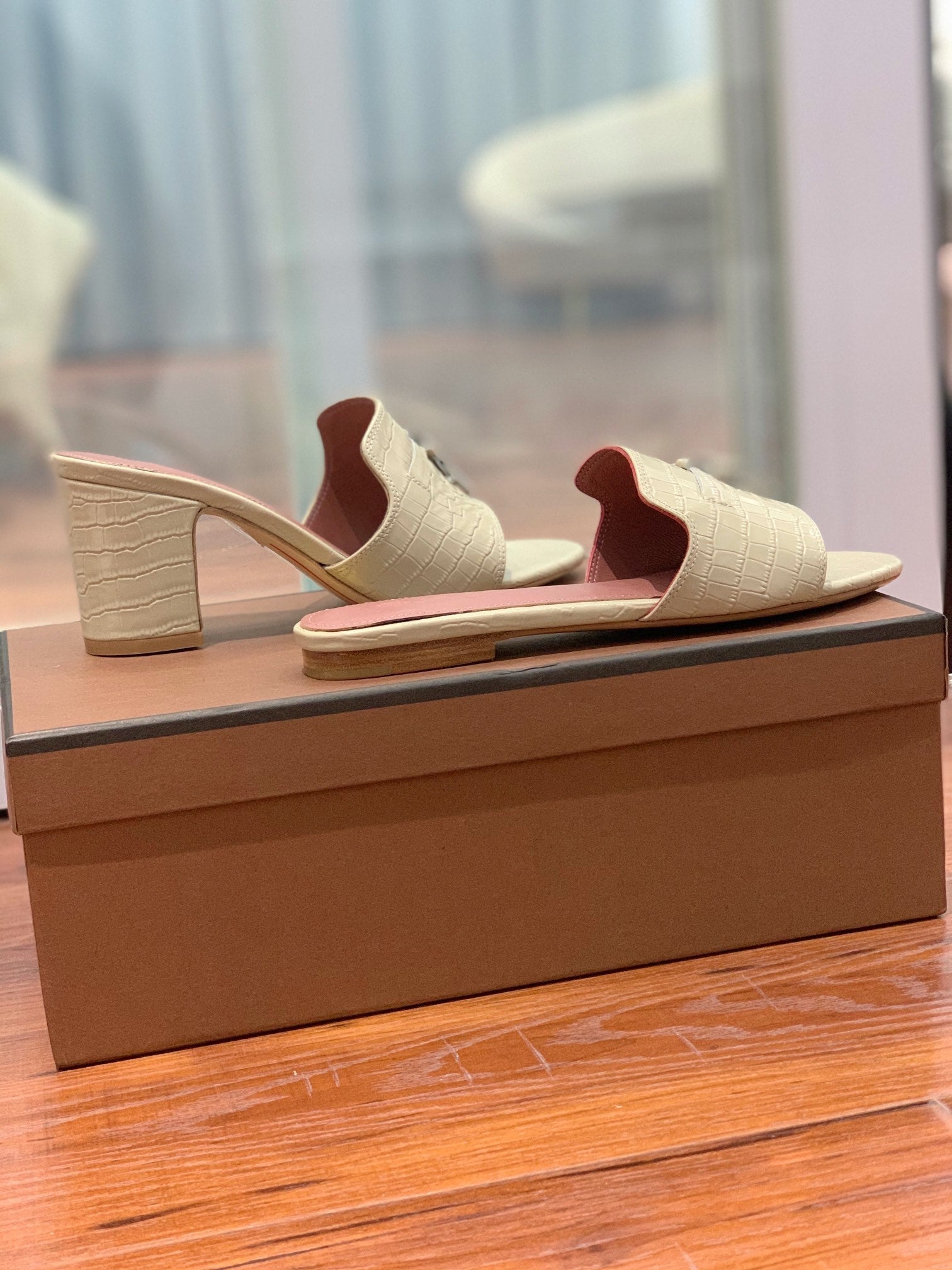 Summer Charms Sandals Mule Beige Crocodile Pattern Pink Lambskin