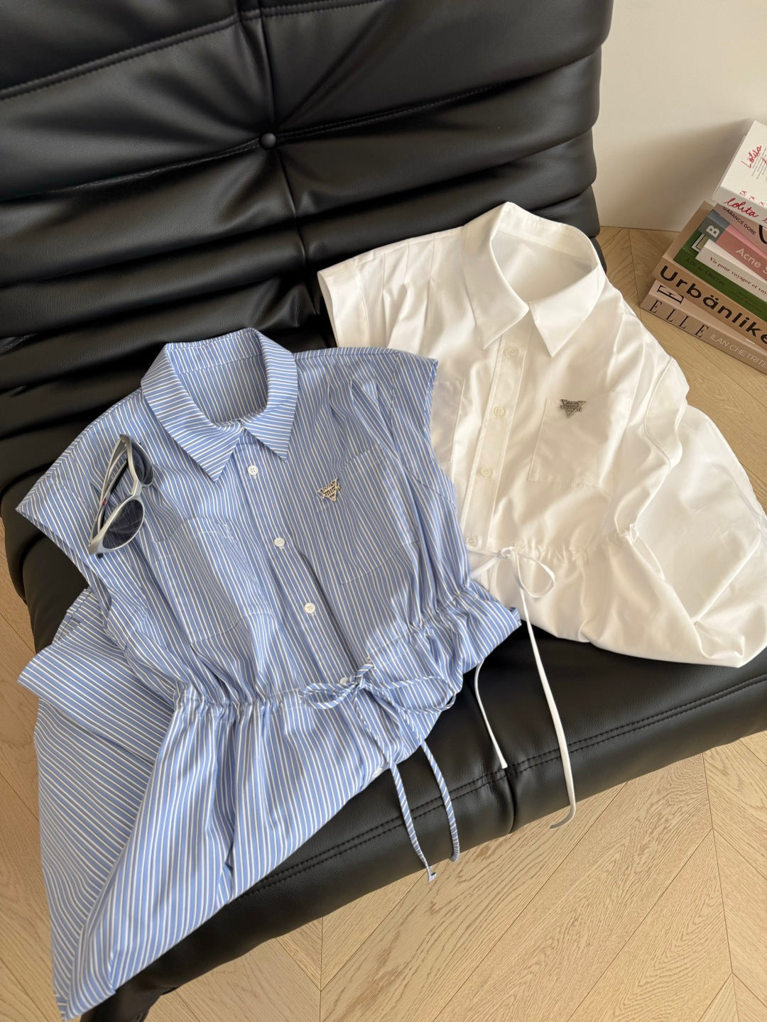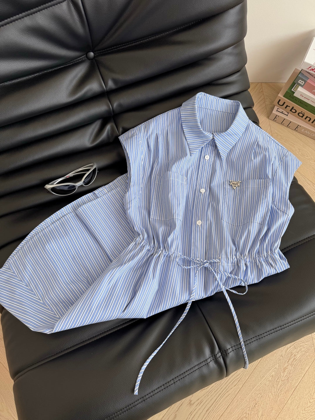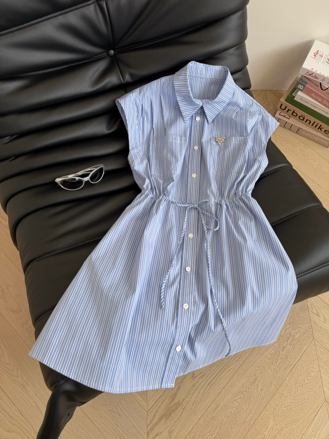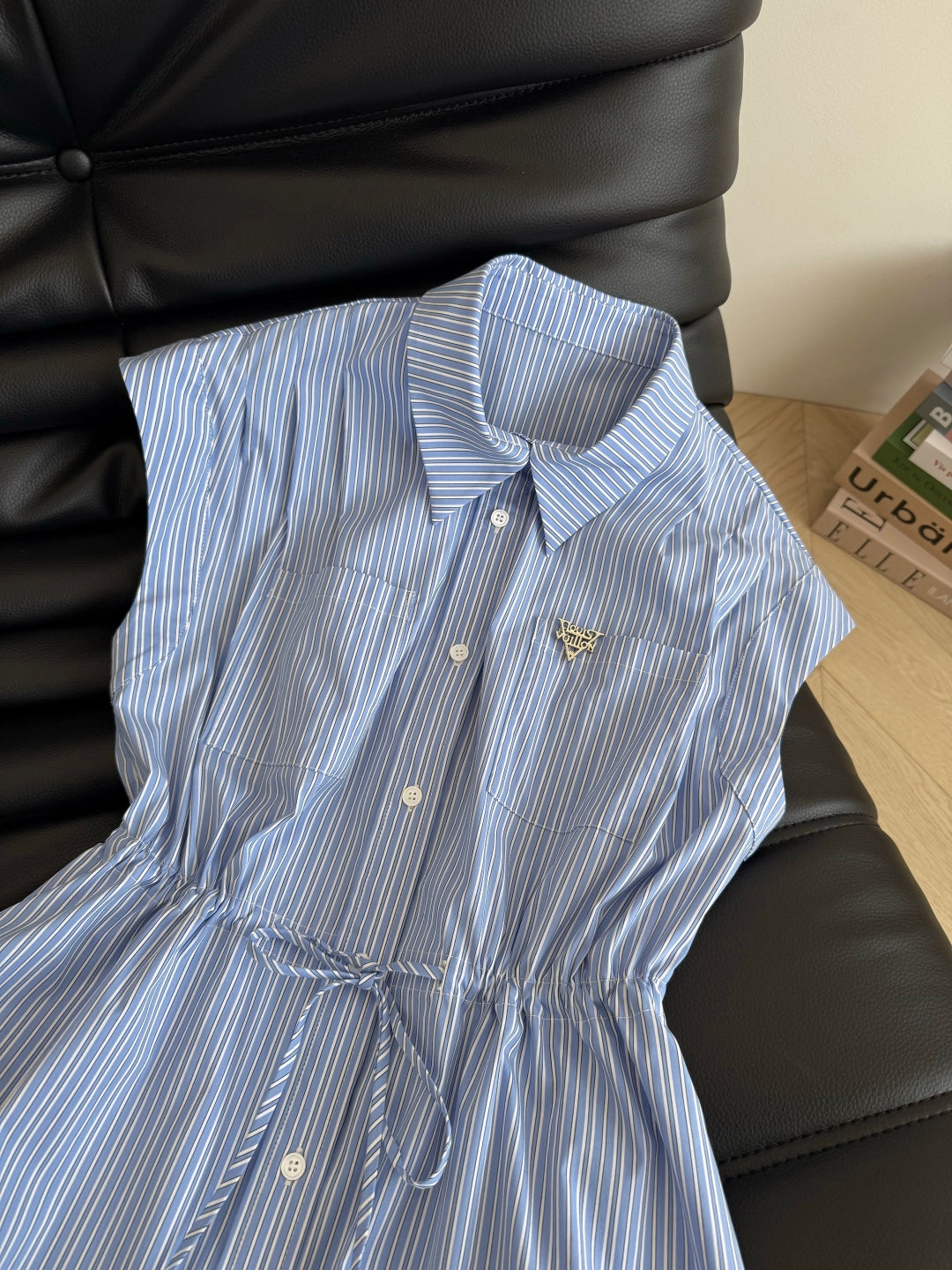 LV 25 Triangle Metal Logo Decorated Dress White Blue Cotton