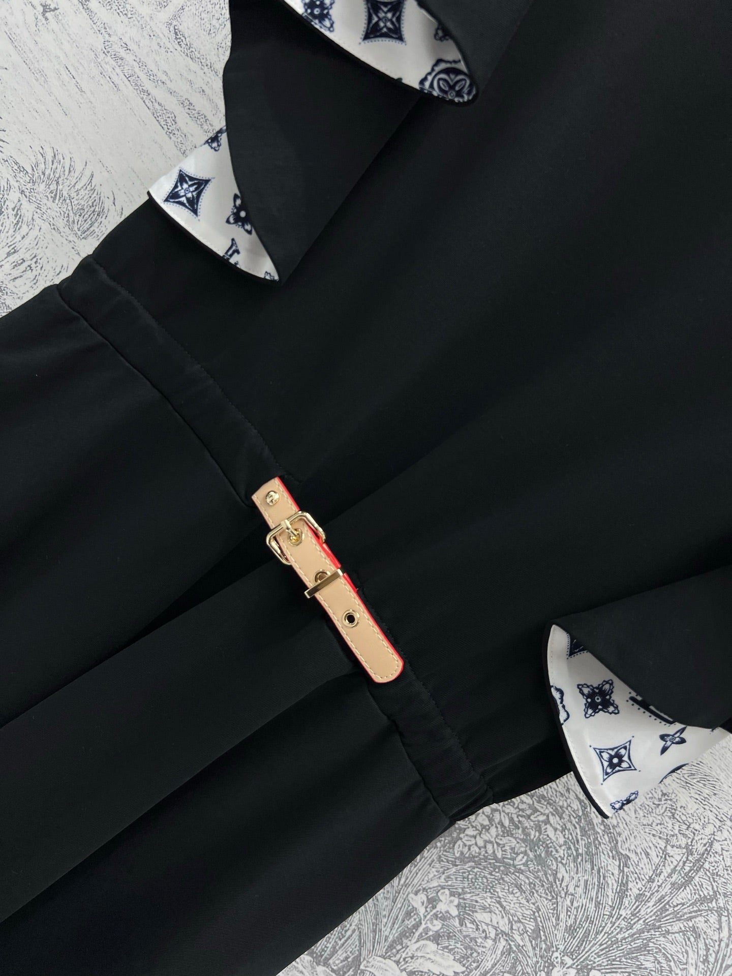 LV 25 Flower Barrage Print Lapel Dress Black Polyester