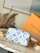 SPEEDY BANDOULIÈRE 20 IN LAGOON BLUE MONOGRAM TILES CANVAS GOLD BUCKLE