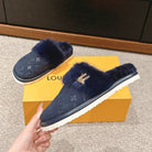 LV Flat Mule Charcoal Blue With Fur Monogram Suede