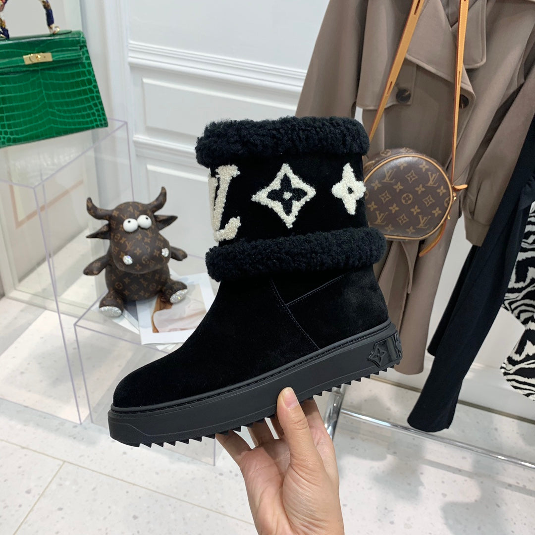 LV Snowdrop Flat Ankle Boot Black Mix White Monogram White Suede