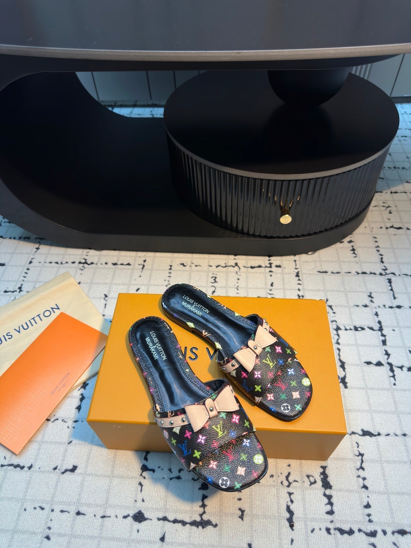 LV 25C LV x TM 6AM Flat Mule Black Bow Mocha Brown with Monogram Multicolore Leather 219951