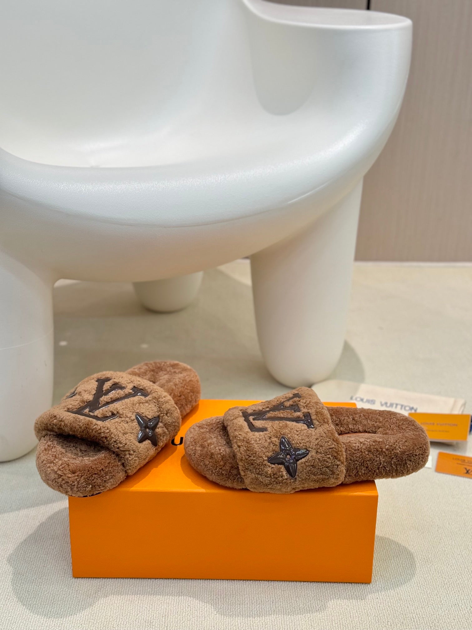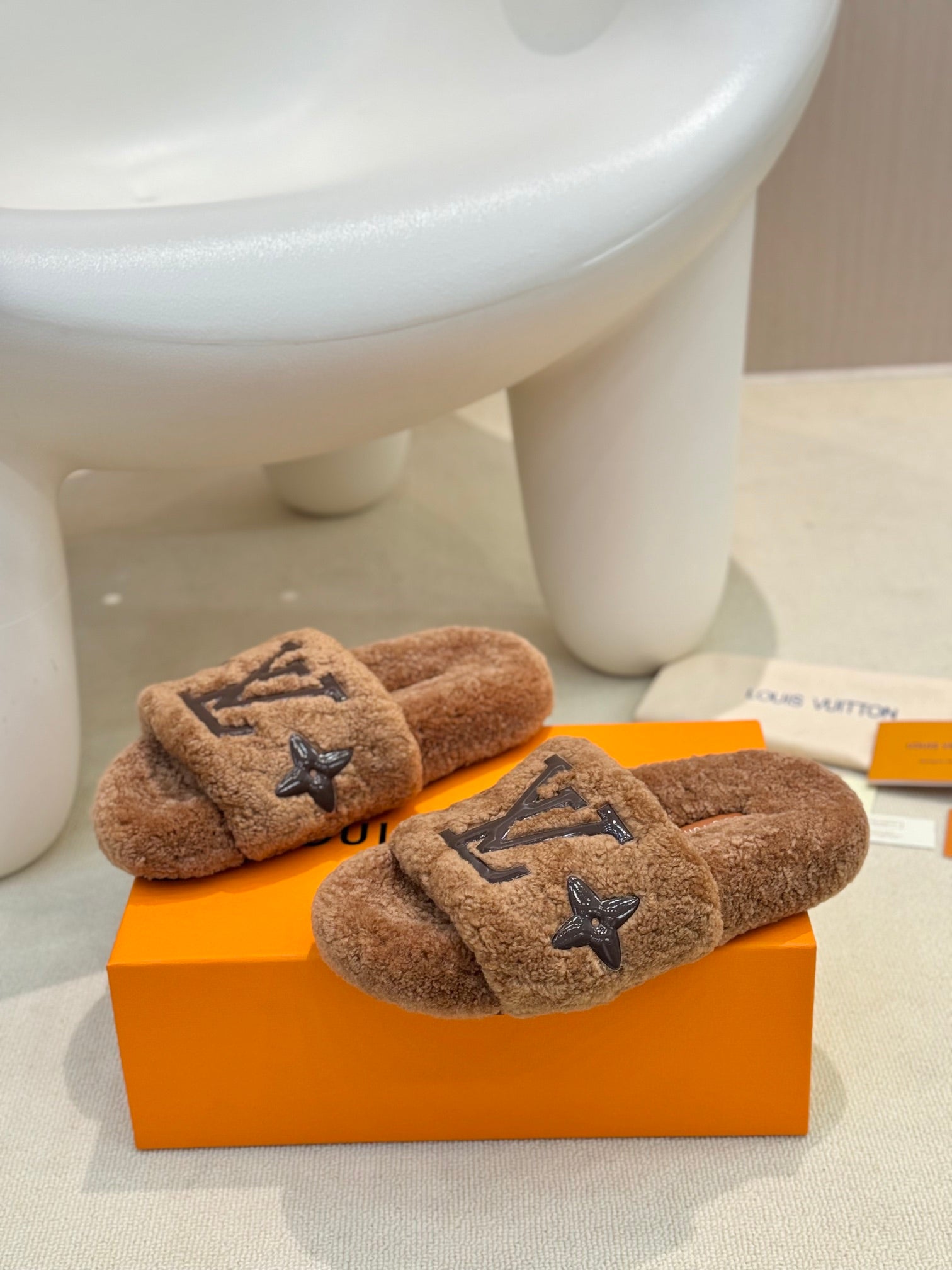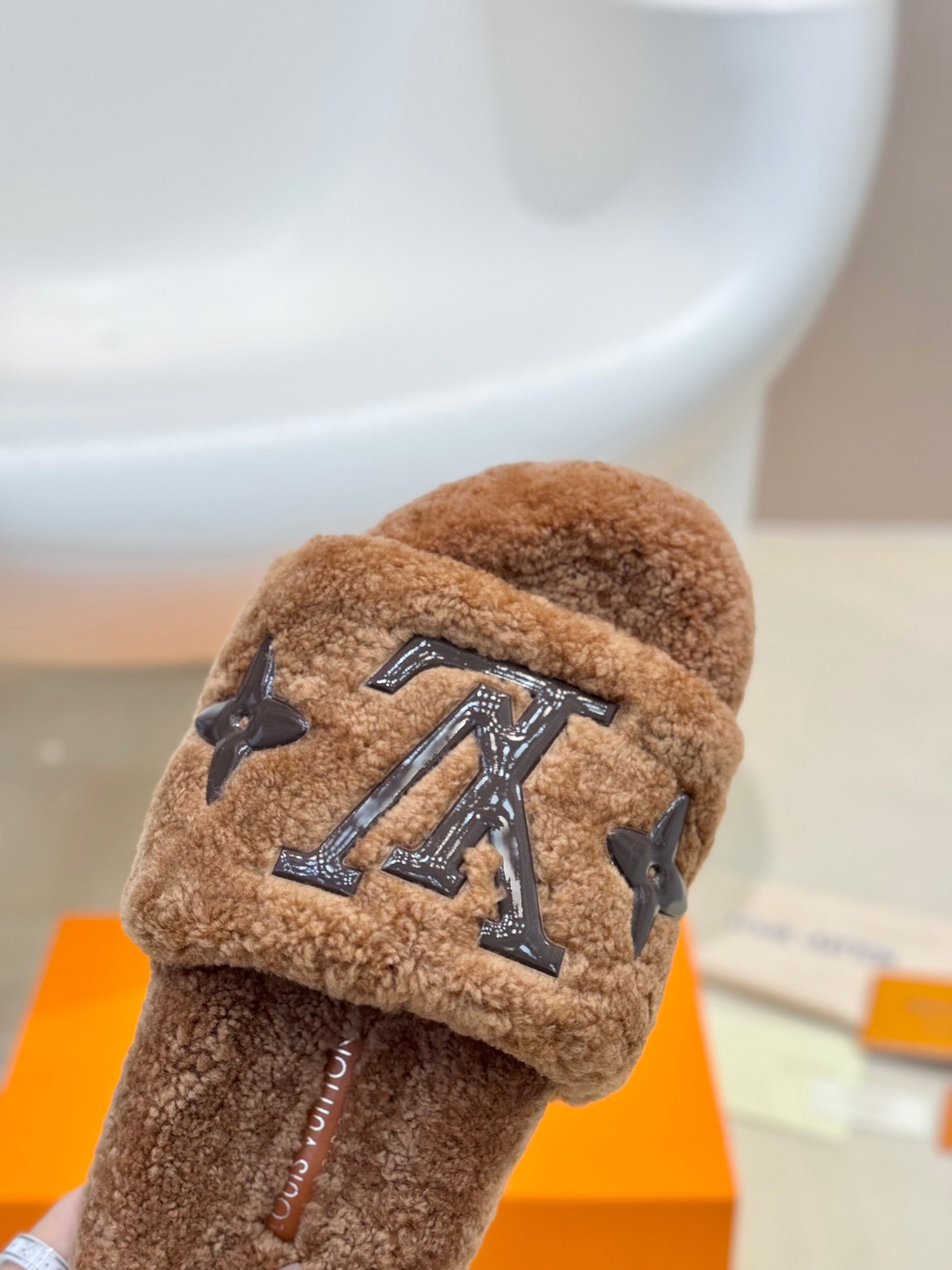 LV Fur Slippers Cocoa Brown With Black Text Pure Wool