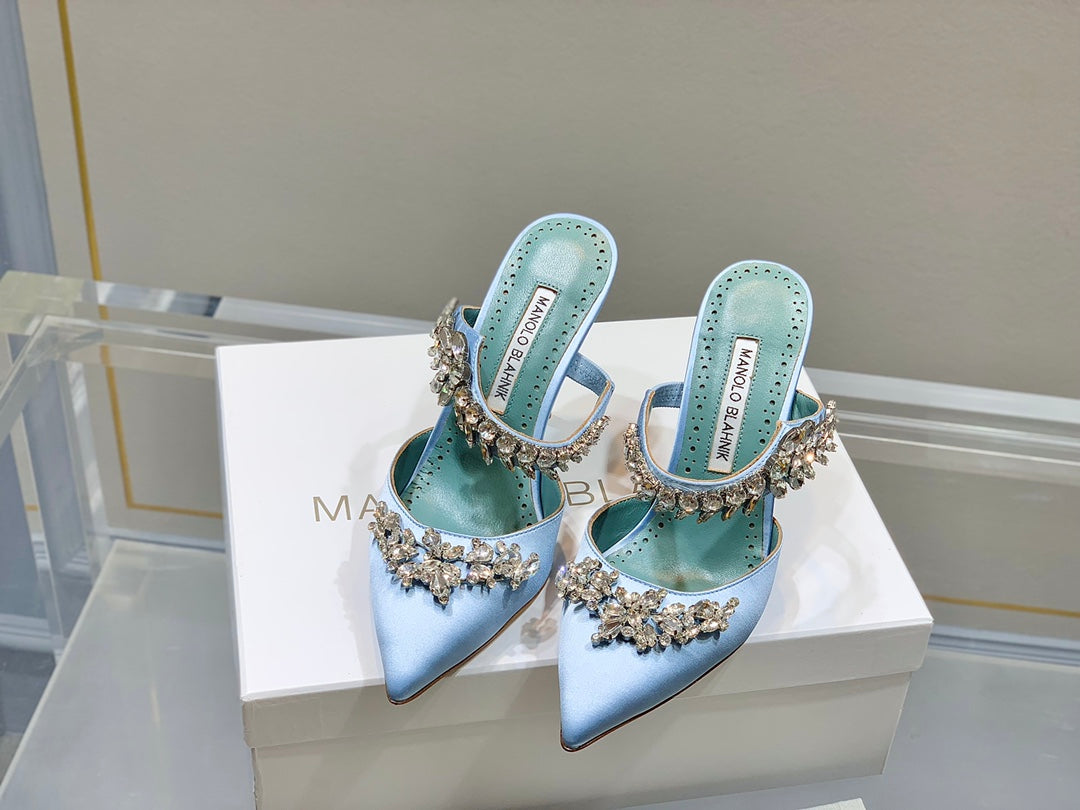 Manolo Mules Crystal Navy Blue Silk Satin 219378