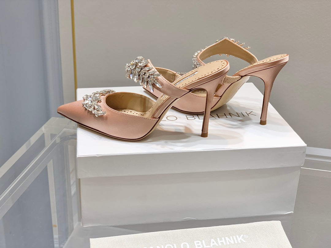 Manolo Flats Mules Crystal Pink Nude Silk Satin 327468