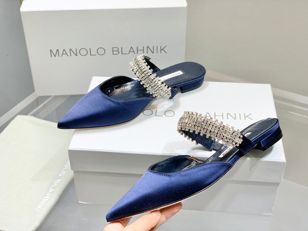 Manolo Buckle Flast Mules Navy Blue Silk 327512