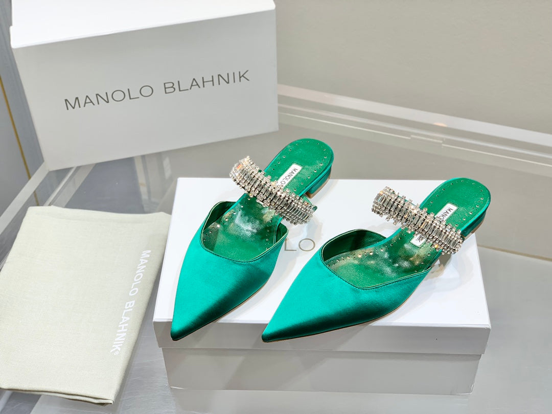 Manolo Flats Mules Crystal Green Silk Satin 327474