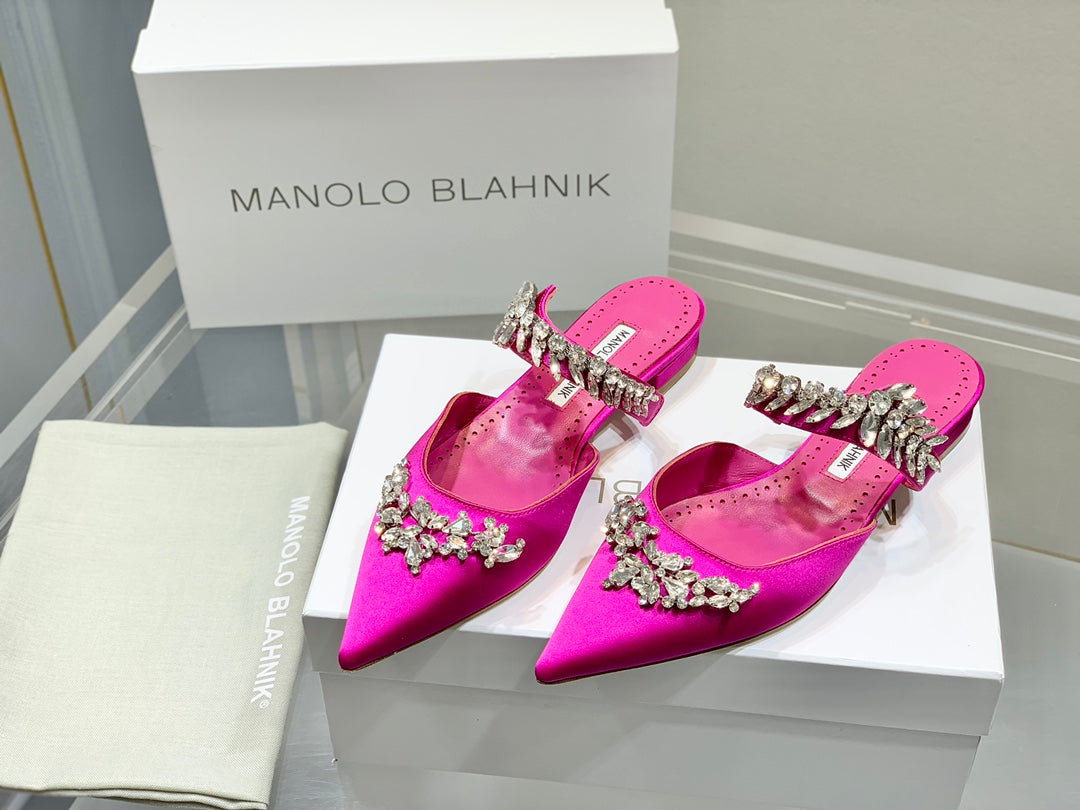Manolo Flats Mules Diamond Buckle Dark Pink Silk Satin 327481