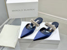 Manolo Flats Mules Diamond Buckle Navy Blue Silk Satin 327482