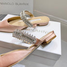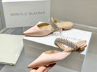 Manolo Flats Mules Diamond Buckle Pink Nude Silk Satin 327488