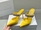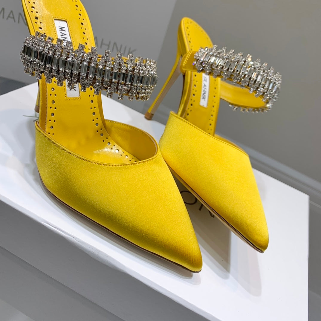 Manolo Mules Diamond Buckle Yellow Silk Satin 218811