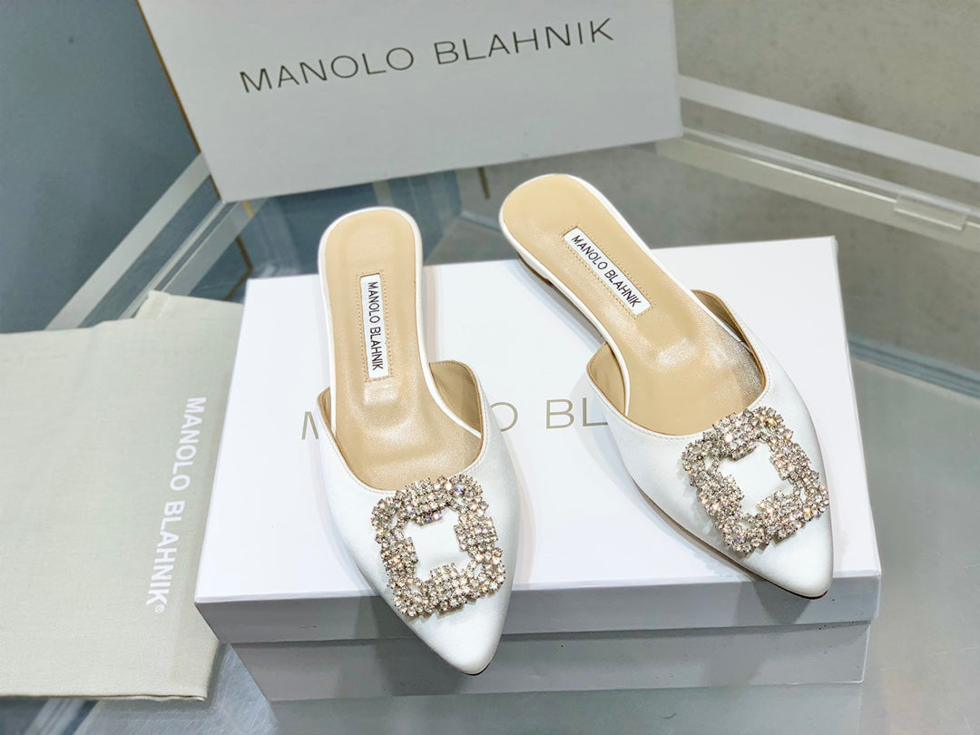 Manolo Flats Mules Diamond Buckle White Silk Satin 327486