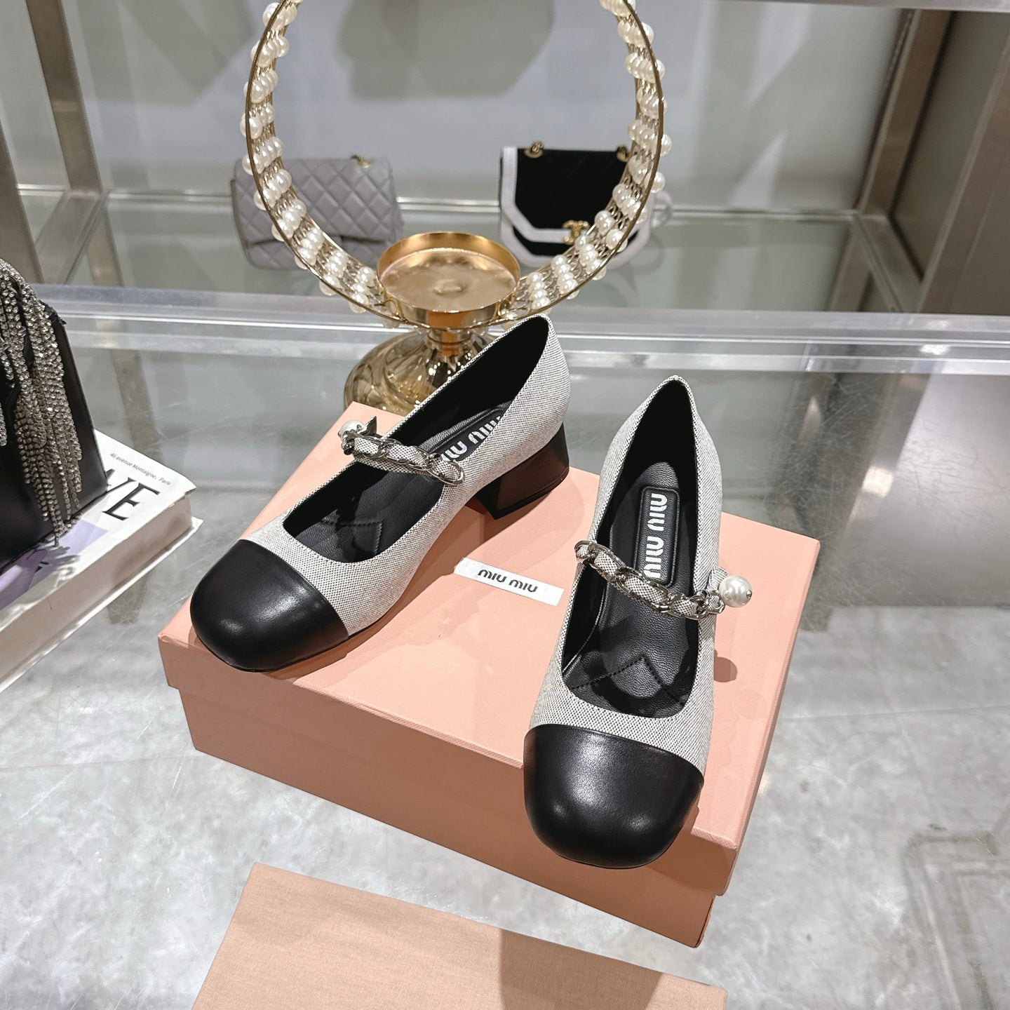 Miu 25C Mary Jane 45MM Beige Gray Mix Black Fabric 235366