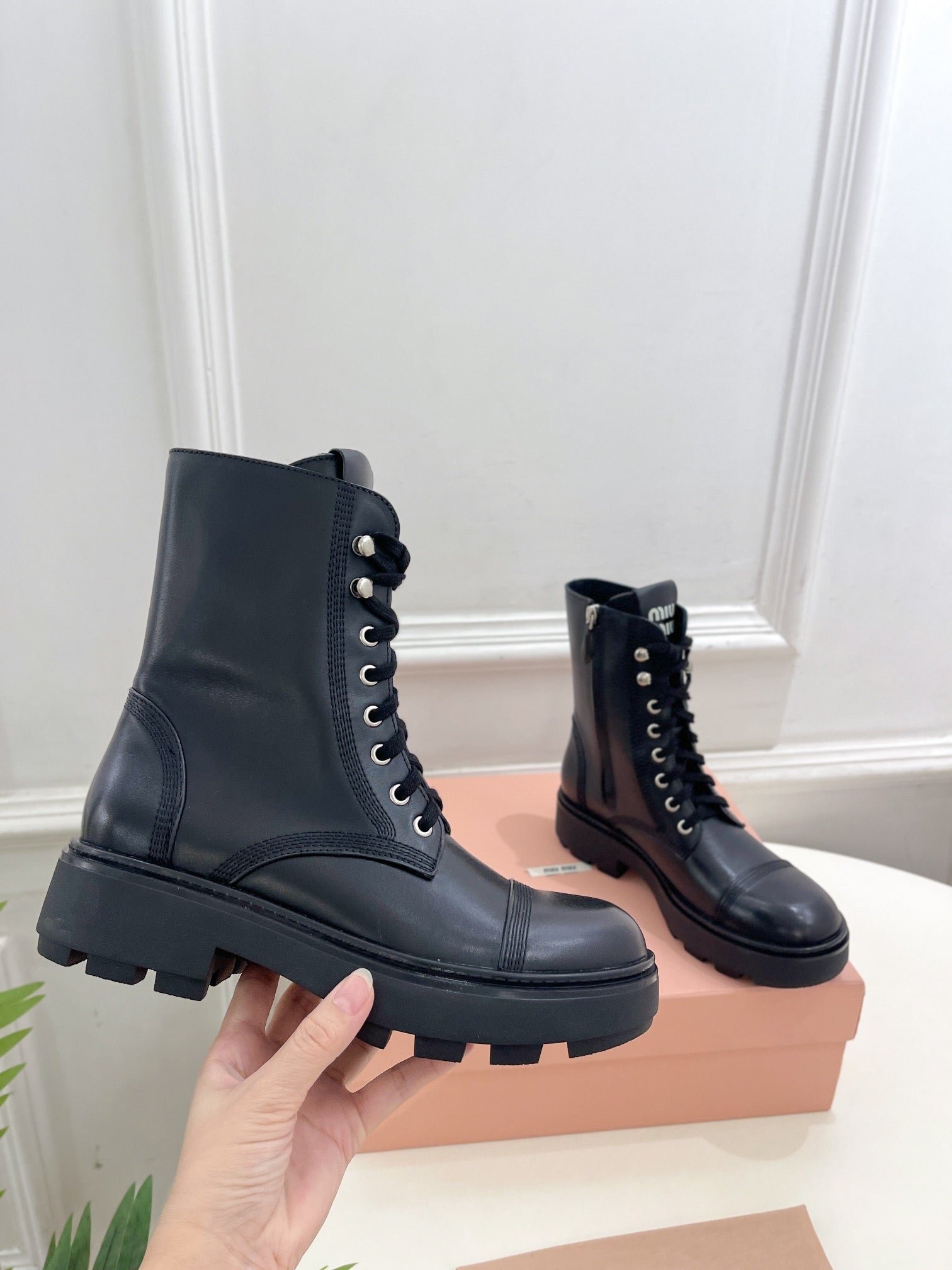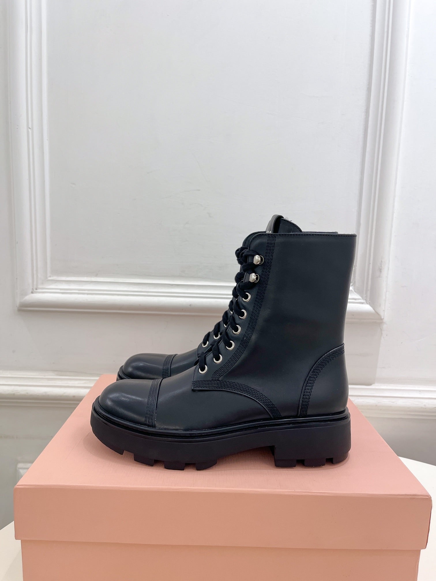Miu Lace-Up Boots Black Waxed Calfskin