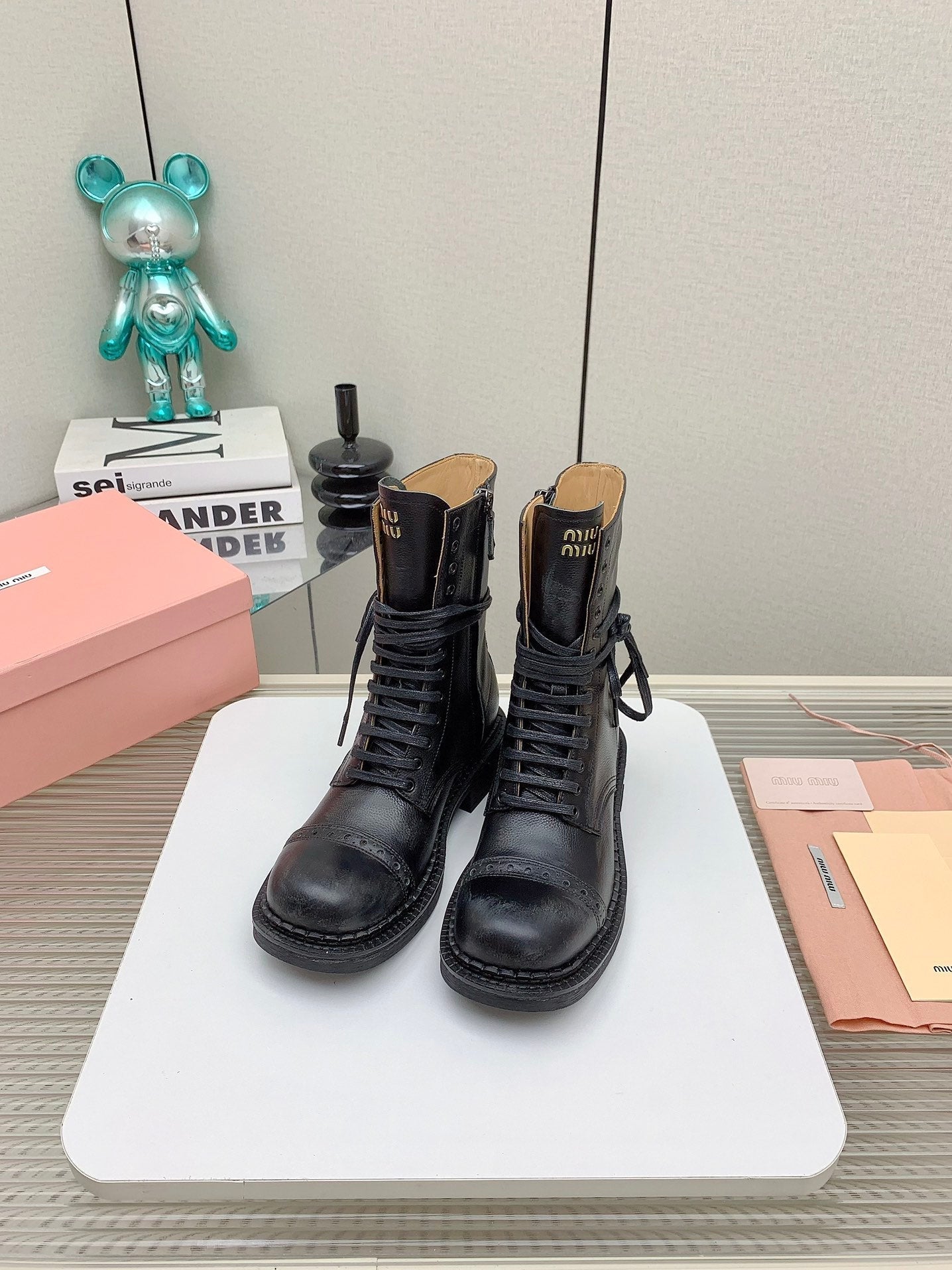Miu Lace-Up Boots Black Waxed Calfskin