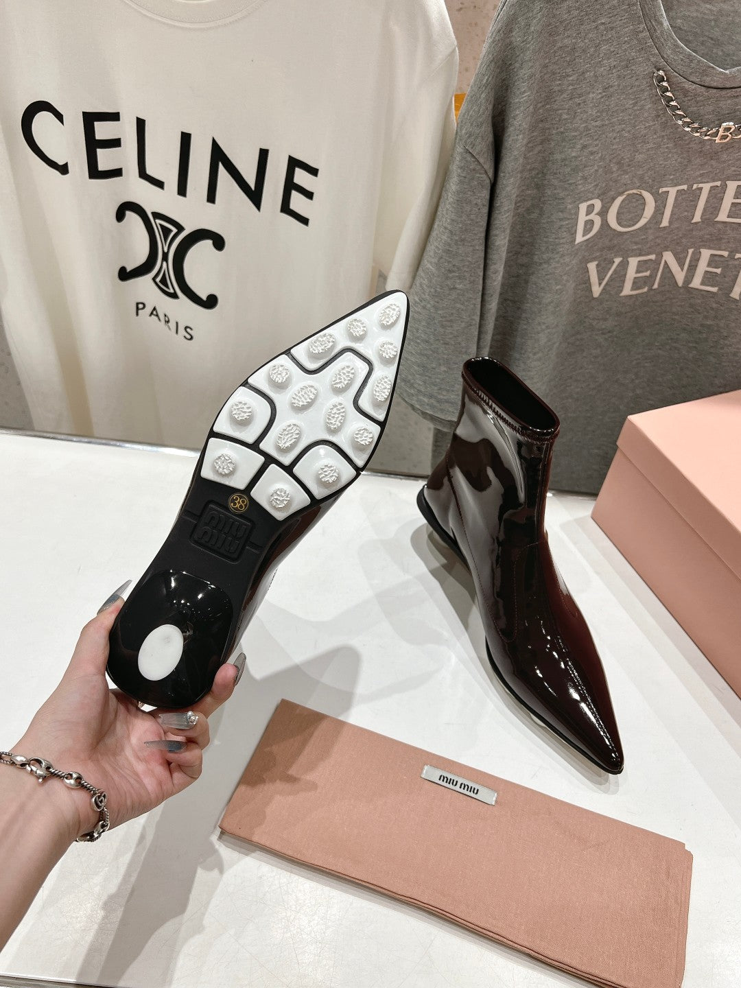 Miu Ankle Boots Pointed Toe Glossy Black Lambskin