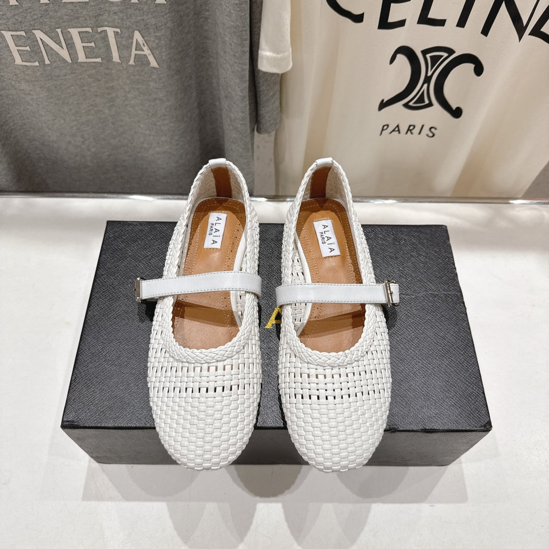 ALAIA MARY JANE FLATS white woven calfskin pattent