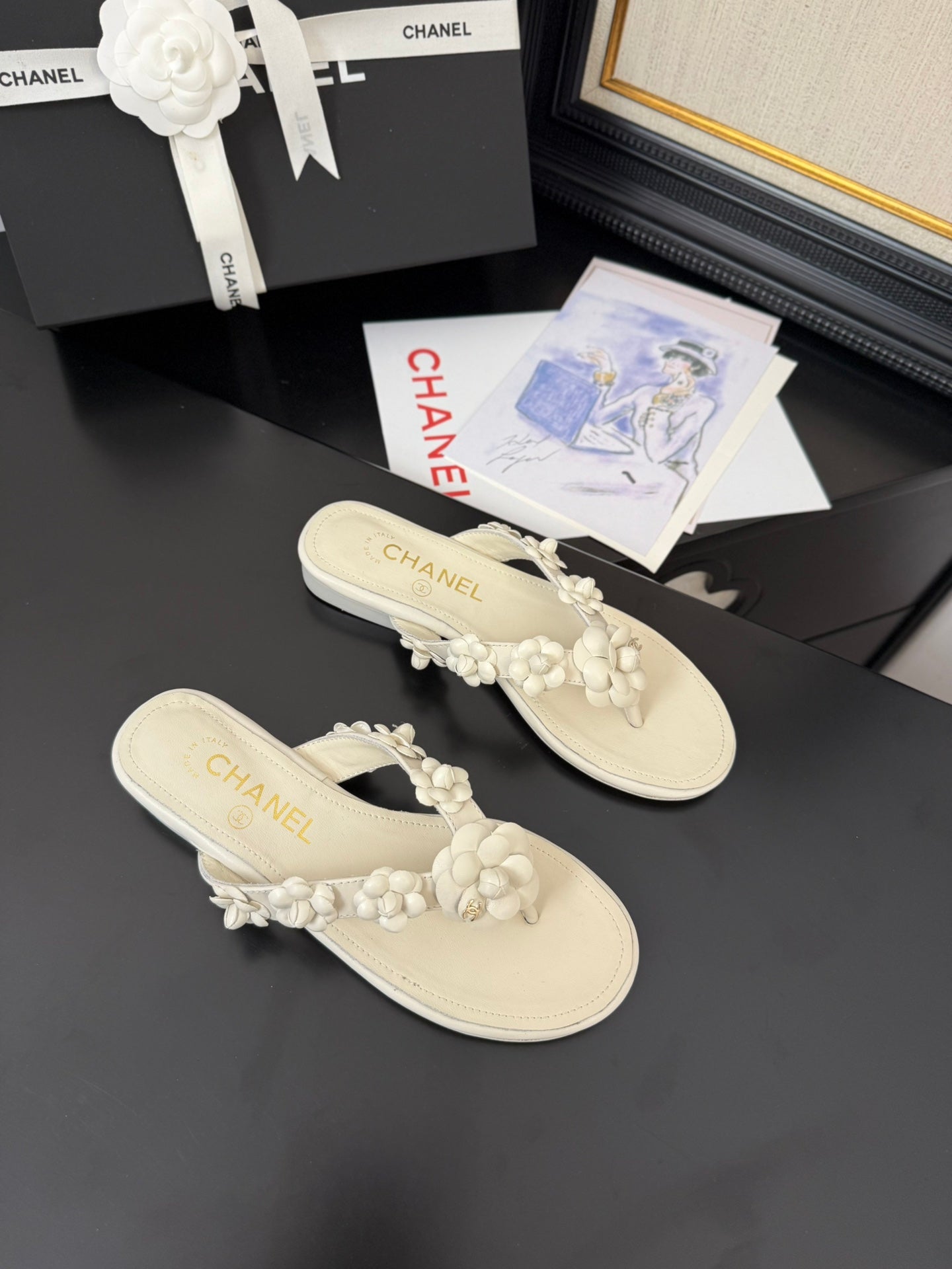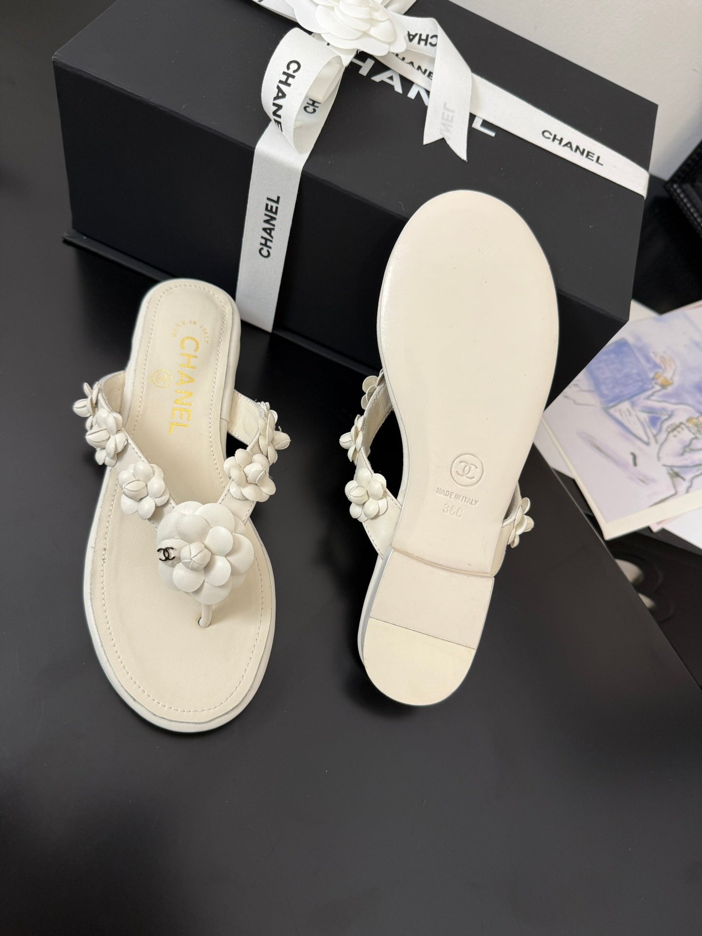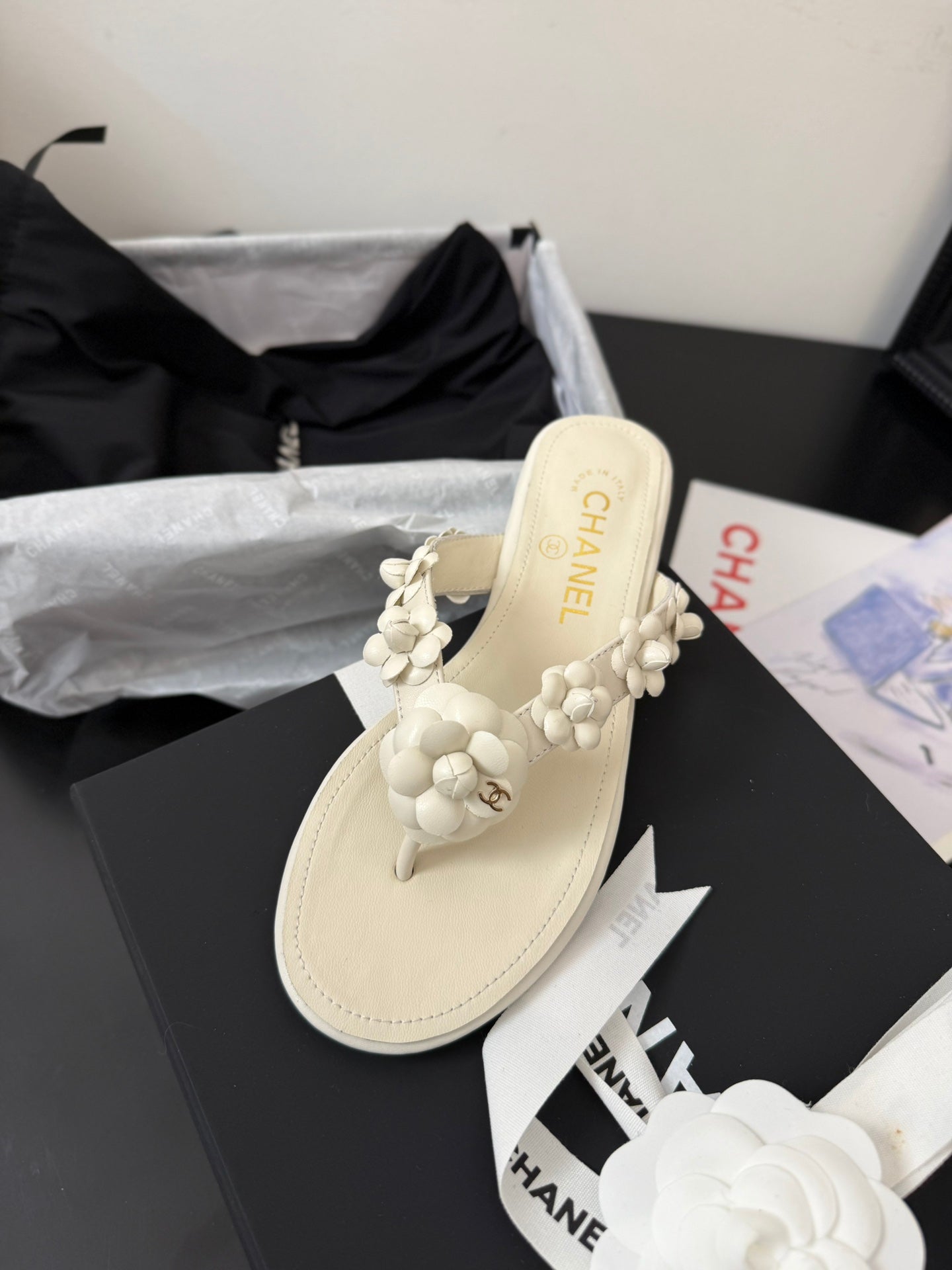 CC 25 Flower Thong Slippers Black Cowhide 233414
