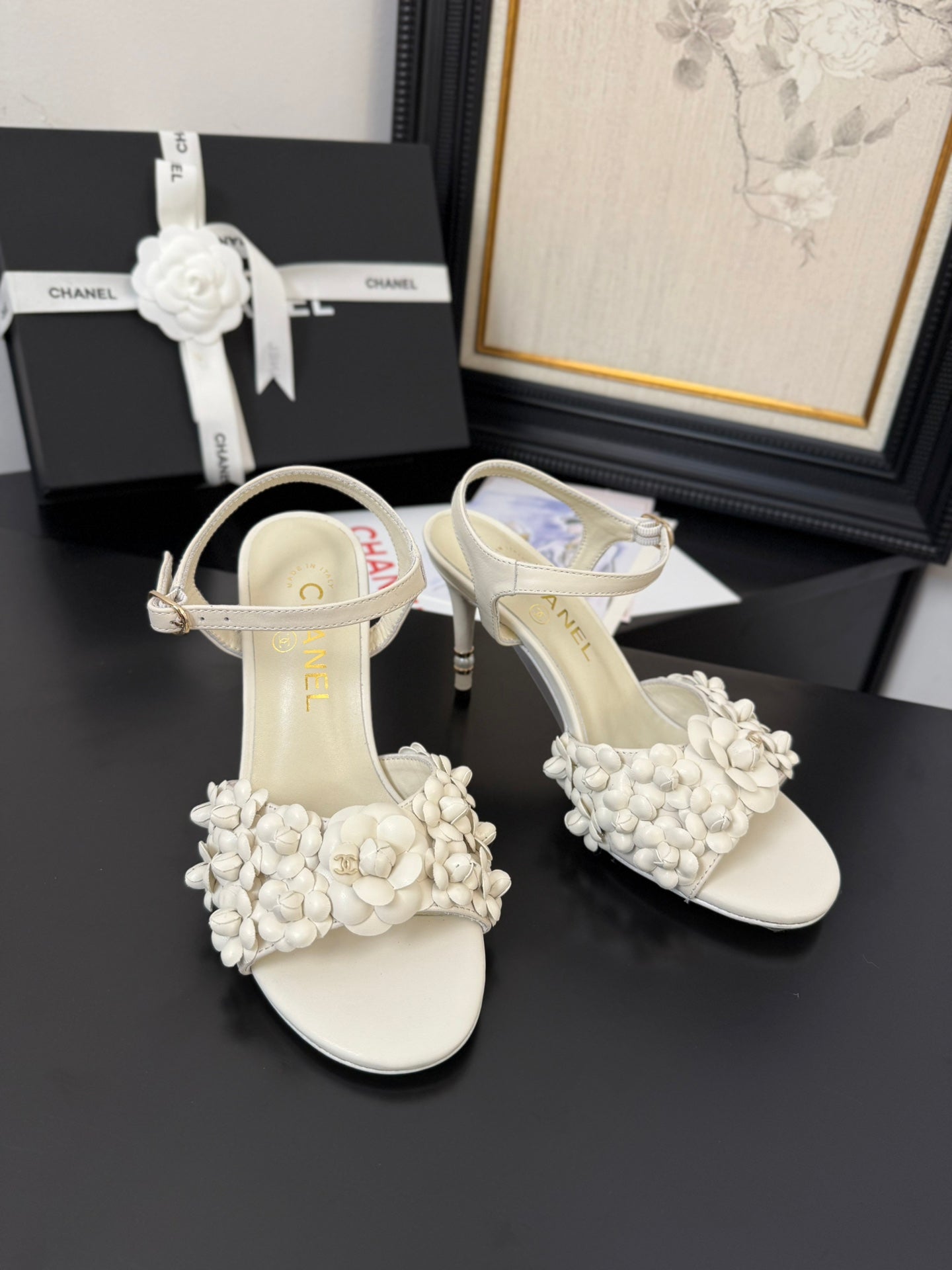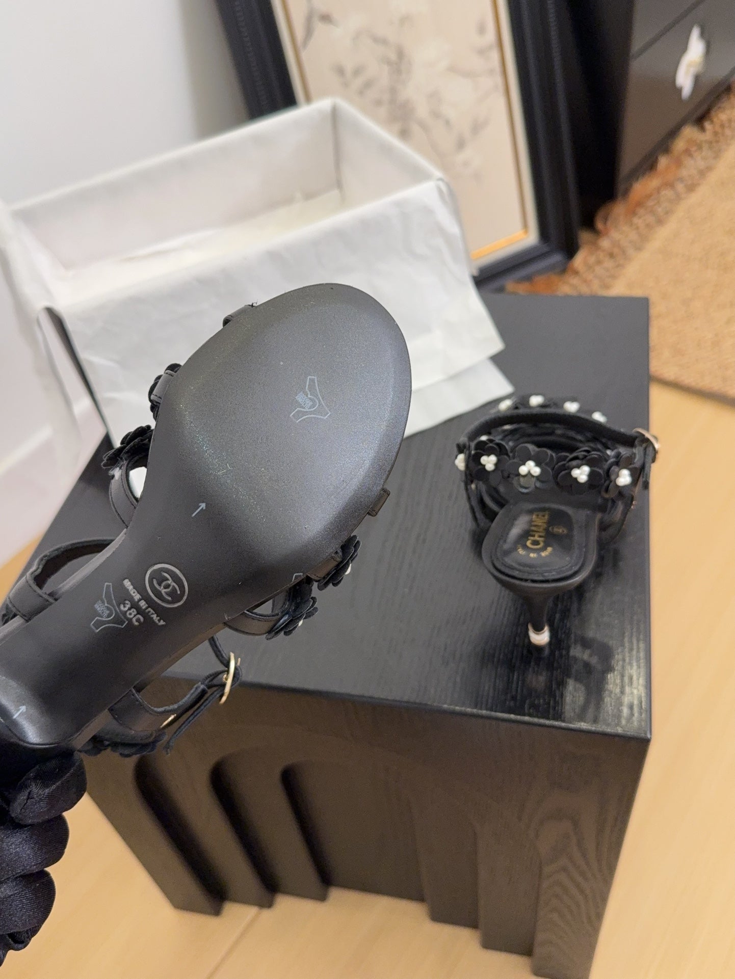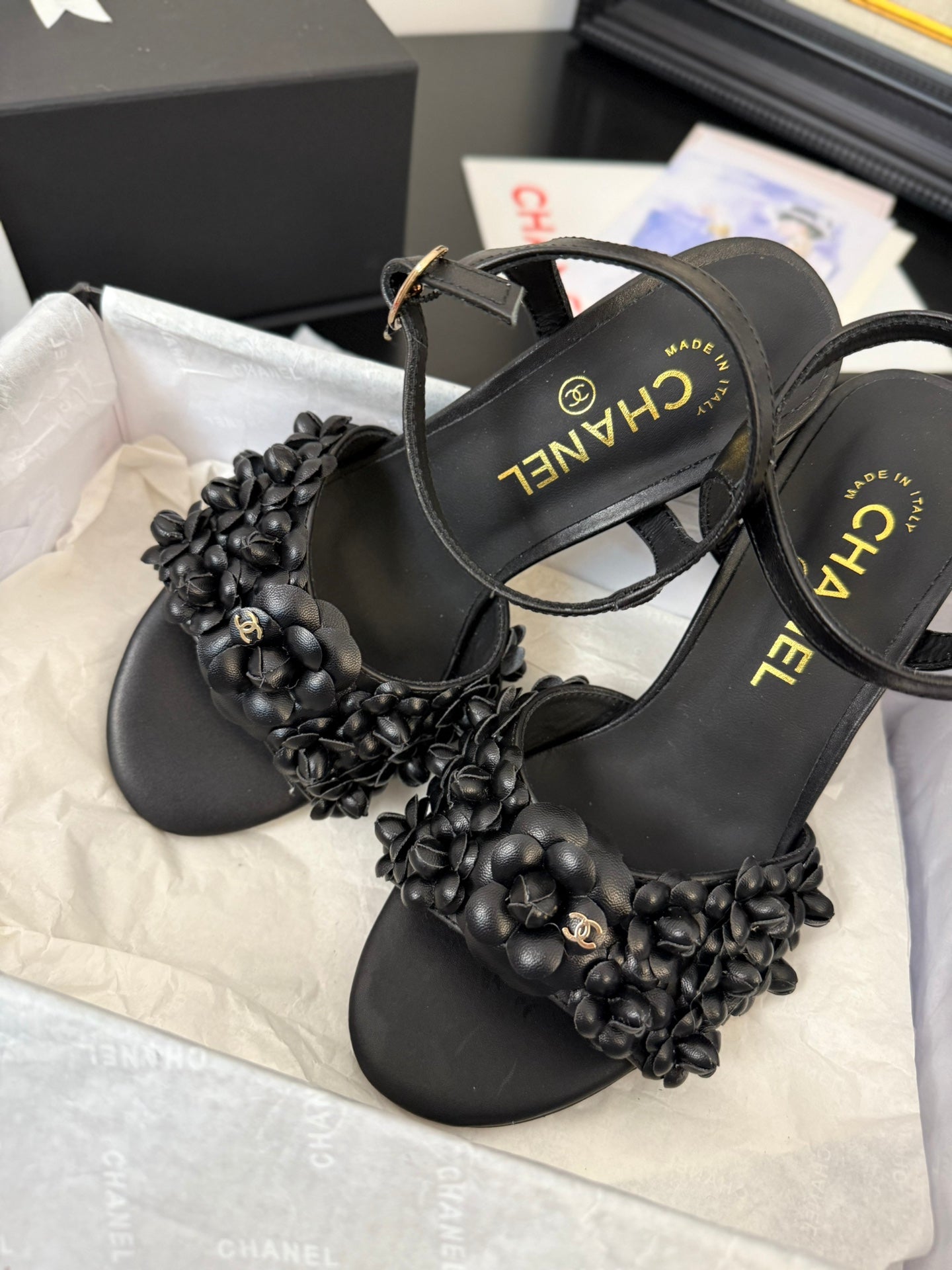 CC 25 Flower Thong Slippers Black Cowhide 233414