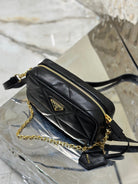 CAMERA BAG 22 IN BLACK TRIANGLE PATTERN QUILTED LAMBSKIN GOLD HARDWARE