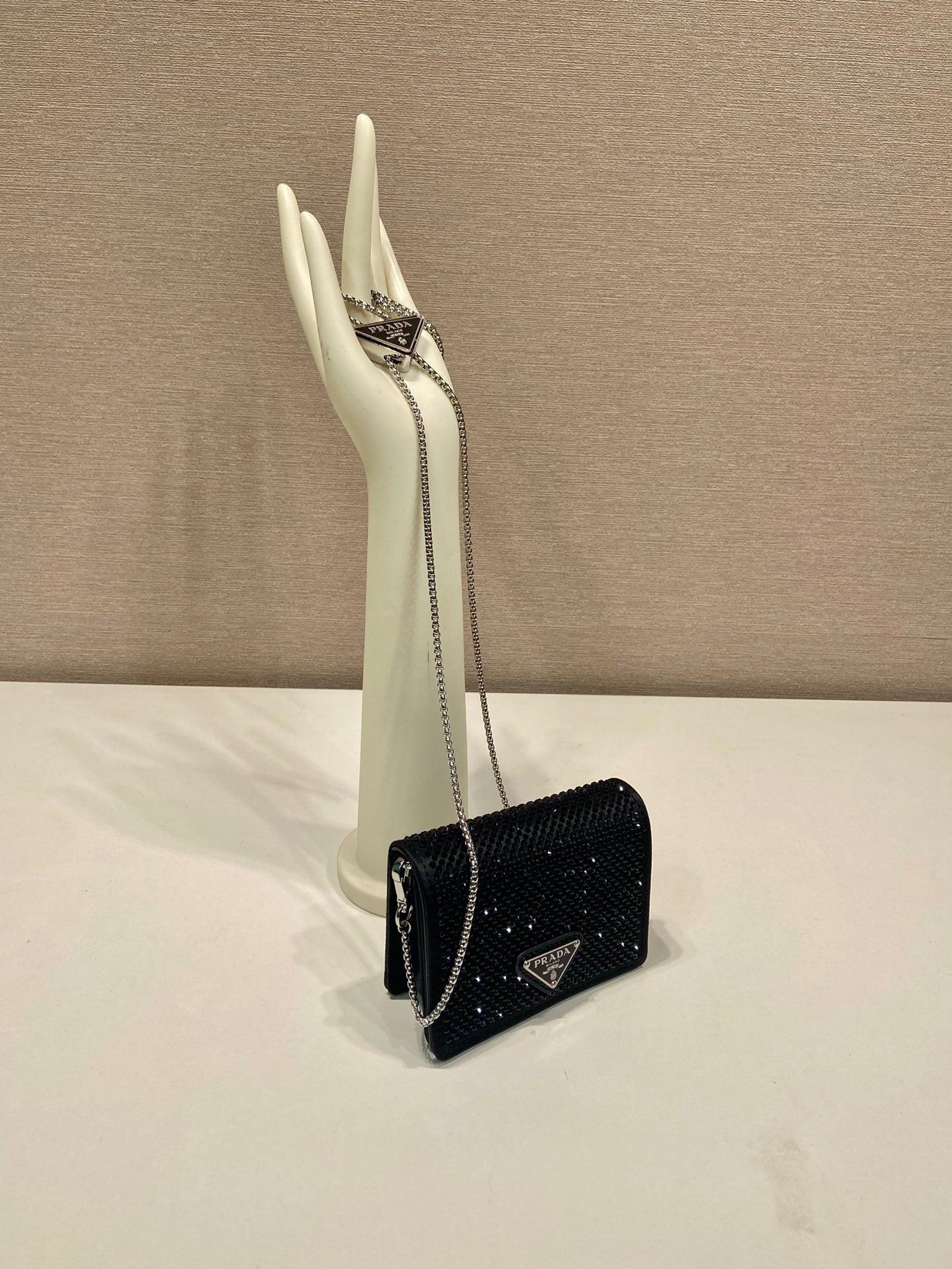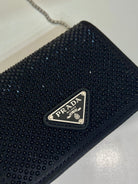 MINI FLAP BAG 11 IN BLACK DUCHESSE FABRIC ATTACHED FULL CRYSTALS SILVER CHAIN