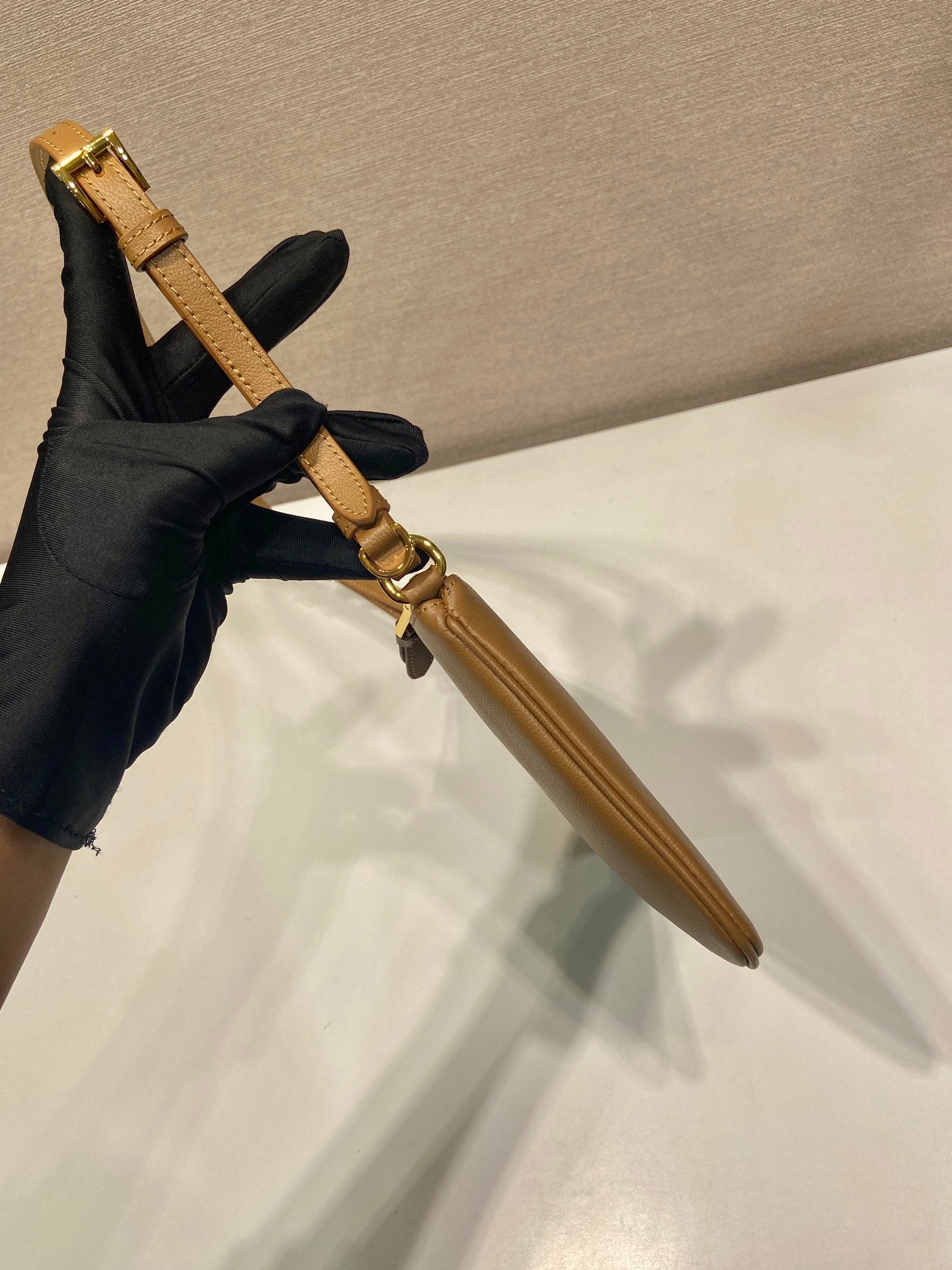 TRIANGLE LOGO SHOULDER BAG 24 IN PEANUT BROWN SMOOTH CALFSKIN