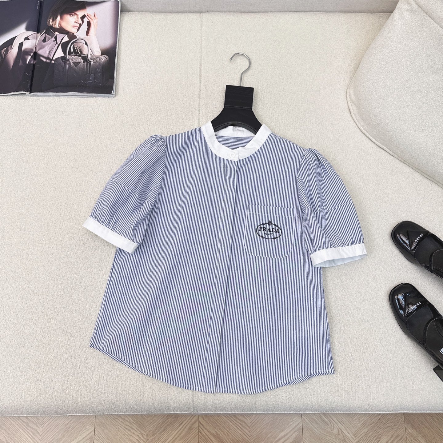 Prada 25 Striped Short-sleeved Collared Shirt Blue Cotton