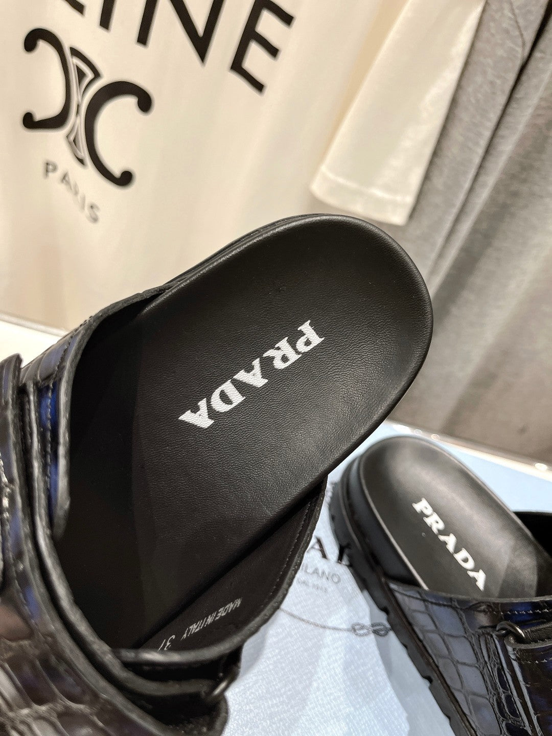 PRA CROCODILE MOTIF STRAP SLIDES SANDALS BLACK AND LAPIS CALFSKIN
